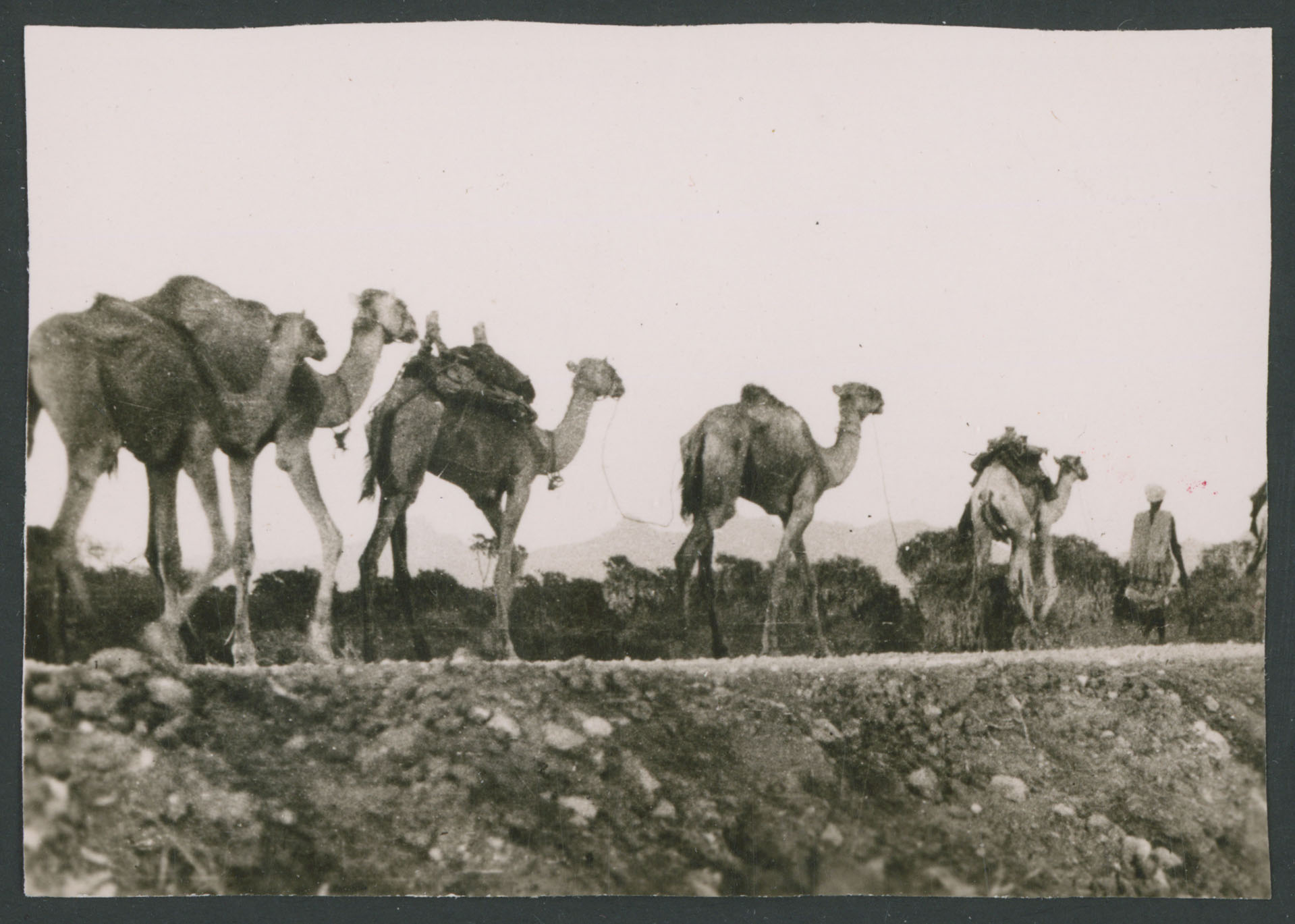 Caravana di dromedari su un terrapieno a Tessenei in Eritrea
