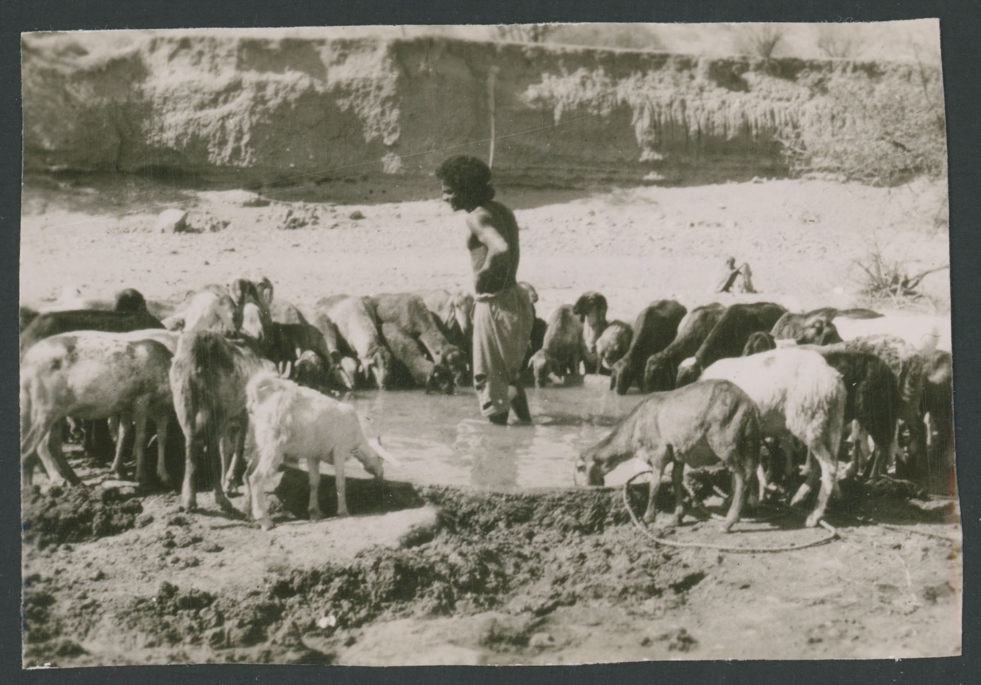 Un pastore con delle pecore che si abbeverano ad una pozza d'acqua ad Agordat in Eritrea