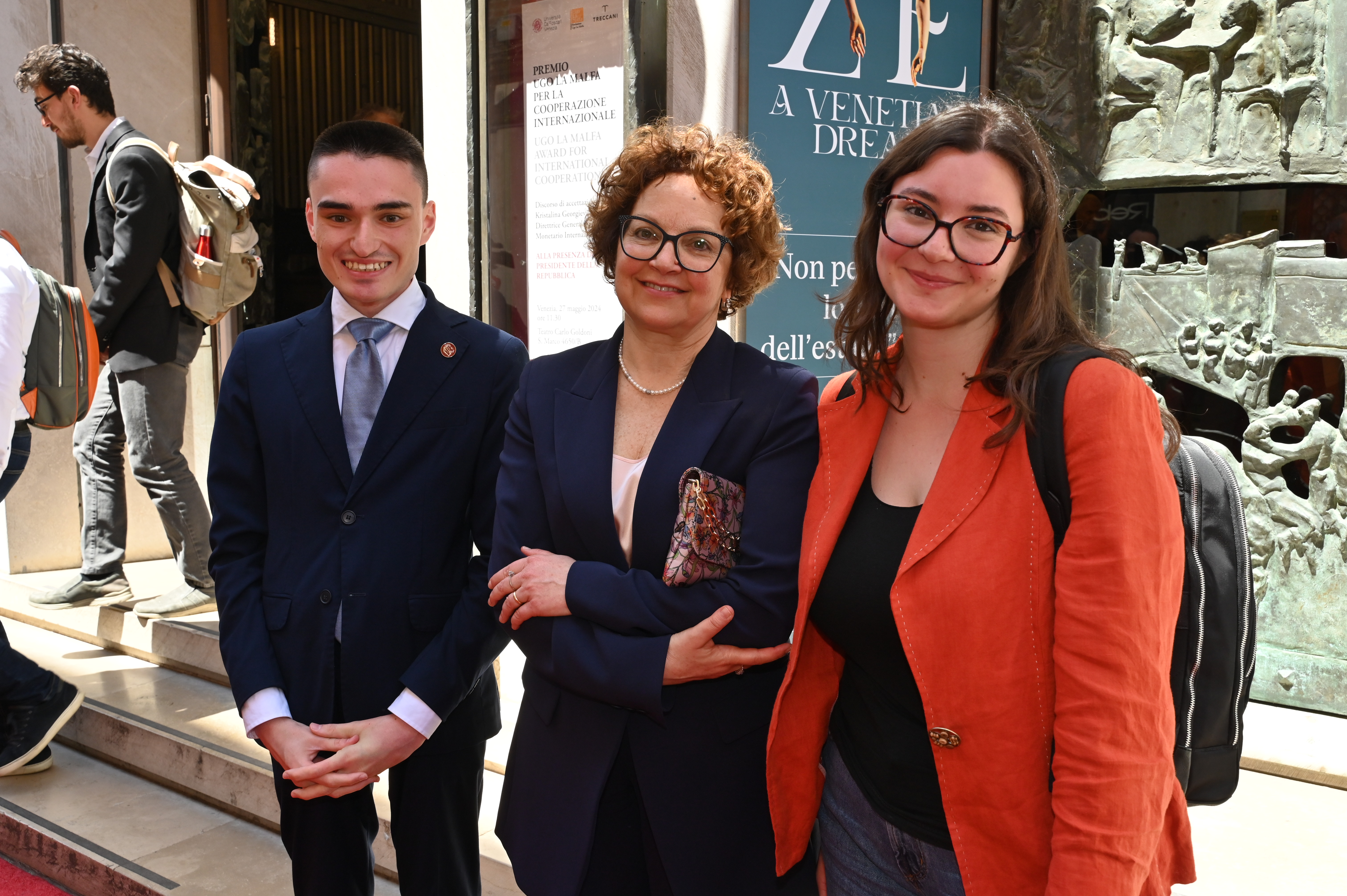 La Rettrice fuori dal teatro Goldoni insieme ad un ragazzo e una ragazza.
