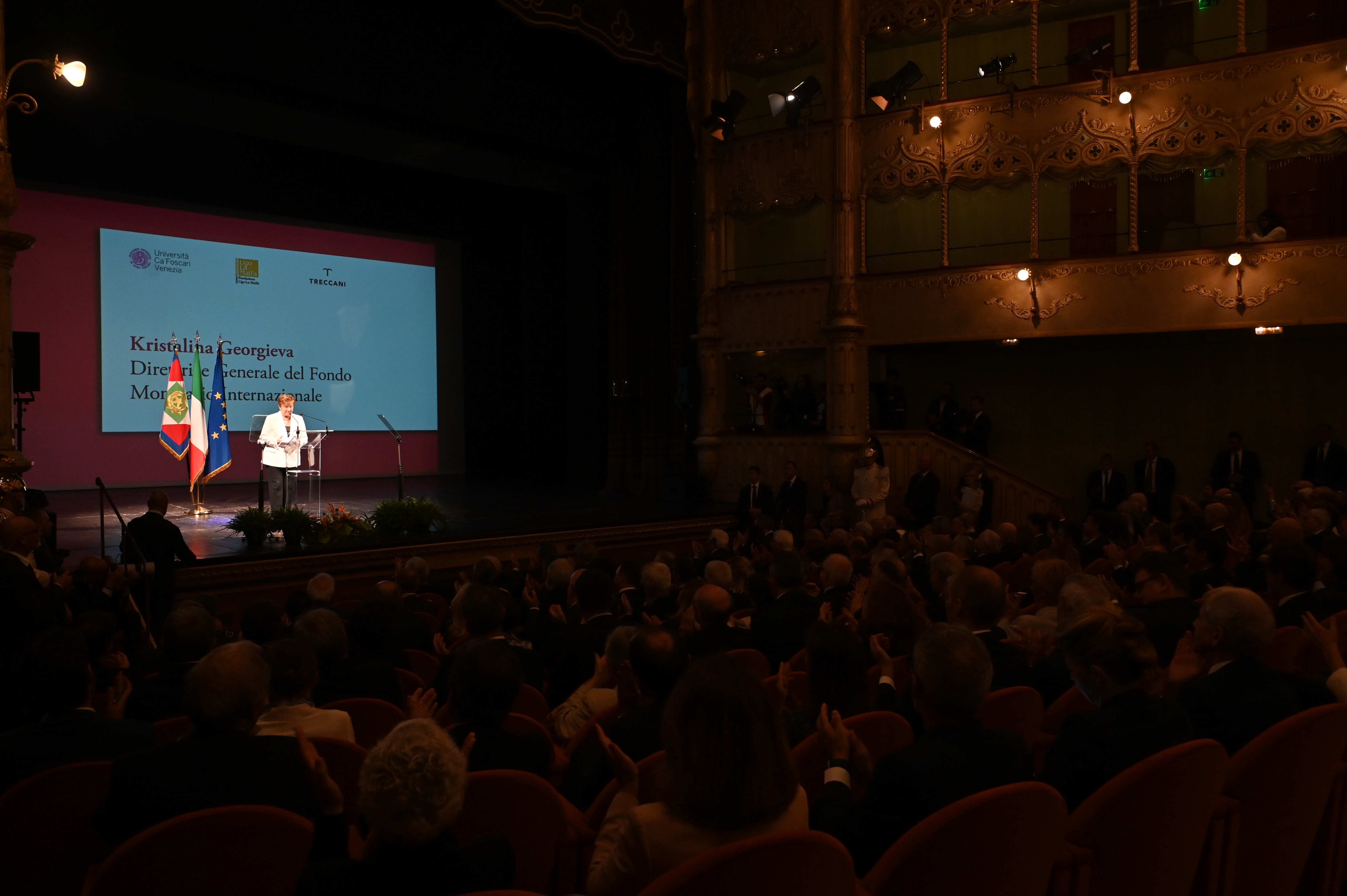 Kristalina Georgieva legge il suo discorso dal palco del teatro Goldoni.