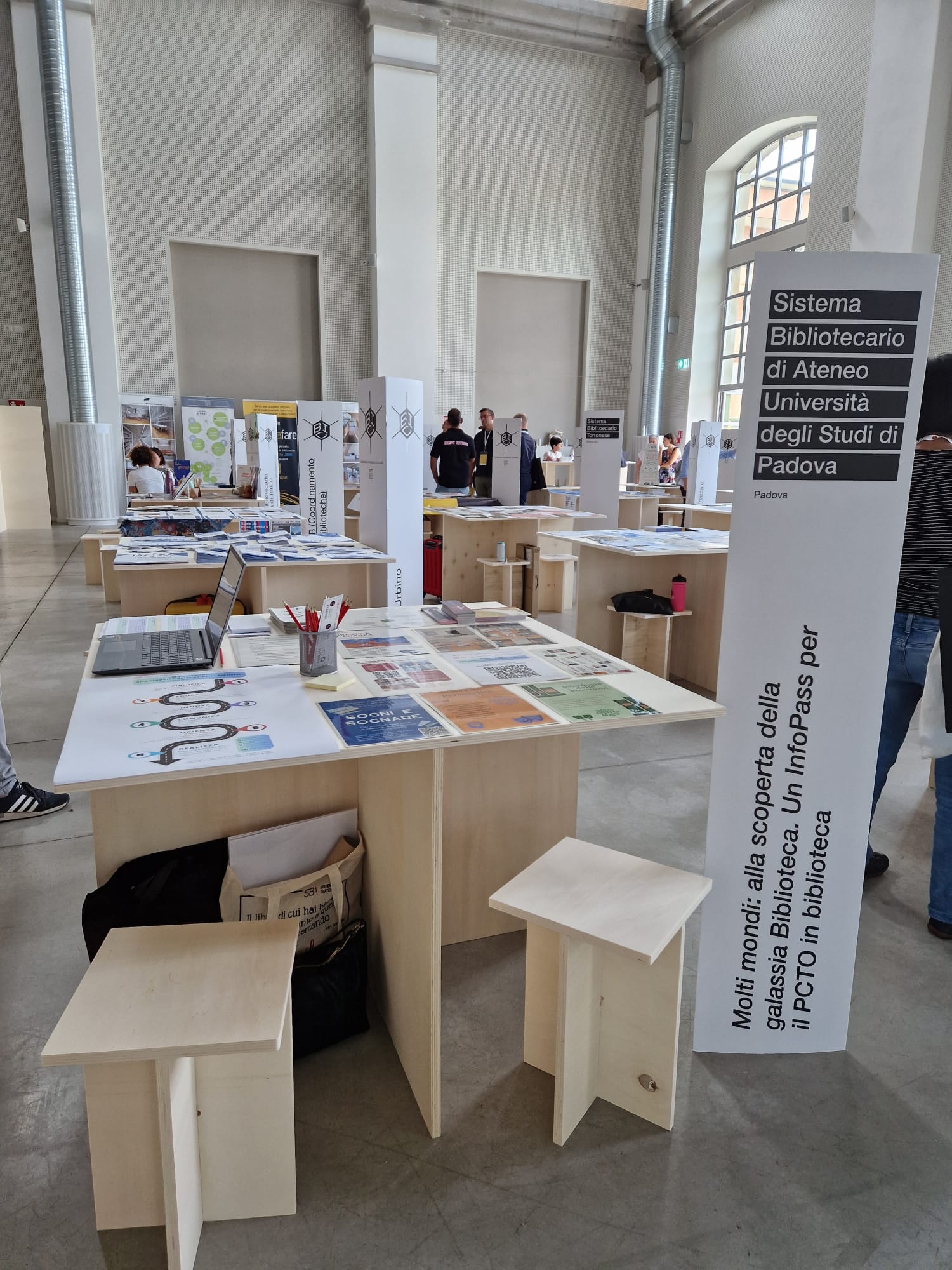 Fotografia dello stand "Molti mondi: alla scoperta della galassia Biblioteca" all'evento BIC 2023, in collaborazione con i colleghi della Biblioteca Centrale di Psicologia, che collaborano al PCTO oggetto di presentazione.