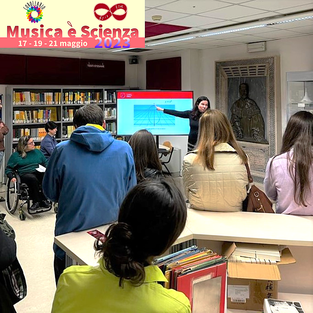 Fotografia scattata durante la visita in biblioteca, tenutasi in occasione della seconda giornata del festival “Musica e/é Scienza” 2023.