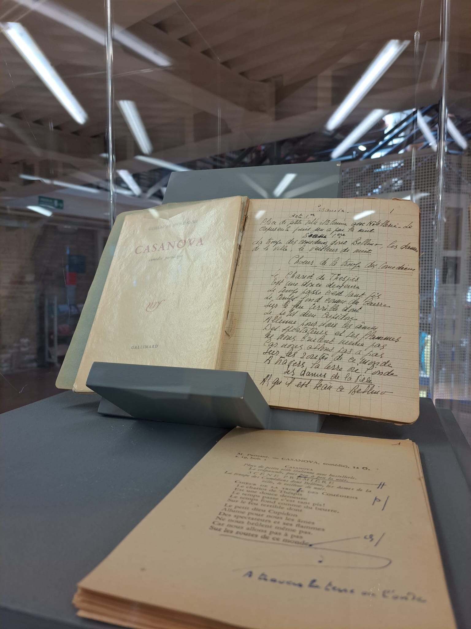 Vetrina disposta a BALI-CFZ in Tesa centrale, contenente il manoscritto completo e le prove di stampa per l’edizione del "Casanova. Comédie parodique" di Guillaume Apollinaire (Gallimard, 1952).
