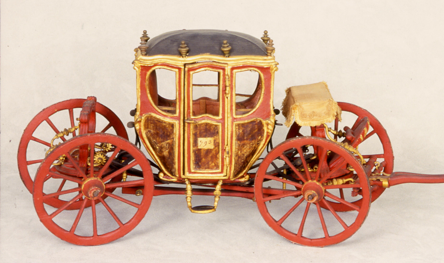 Il modello viene descritto nell’inventario come “una piccola carrozza con le quatro ruote alte e stanghe incrociate […] per scuotersi meno e dar meno fatica ai cavalli”. Questo particolare tipo di carrozza venne ideato e realizzato dal conte Luigi Rizzetti di Castelfranco Veneto. Il modello mostra le innovazioni proposte da Rizzetti per il miglioramento dei veicoli, ossia l’introduzione di ruote anteriori grandi quanto quelle posteriori, di sospensioni a cinghie di cuoio e di un sistema a due barre incrociate posizionato sotto la carrozza che rendeva sterzanti anche le ruote posteriori, riducendo così lo sforzo del conducente alla guida.