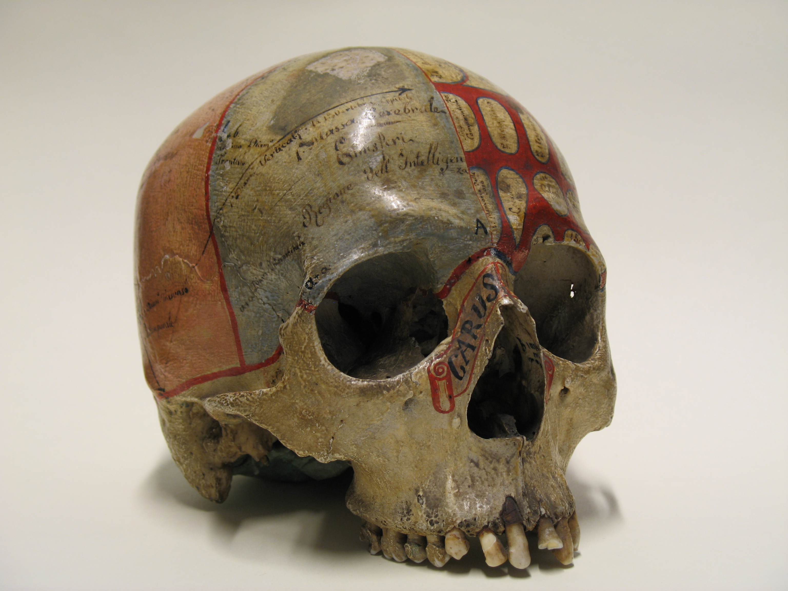 I crani frenologici costituivano veri e propri modelli per la ricerca e la didattica.Secondo i principi della frenologia elaborati a fine ‘700 dal medico viennese Franz J. Gall, si può dividere il cervello in 27 aree, ognuna associata a una facoltà intellettuale o disposizione morale. Più una caratteristica è spiccata, più l’area corrispondente cresce in dimensioni creando delle protuberanze nella scatola cranica. Soggetta a violente controversie, la frenologia venne screditata nella seconda parte dell’800, pur rimanendo in voga in alcuni ambienti. Diversi studiosi si interessarono alla frenologia, quali Joseph Vimont o Carl G. Carus.