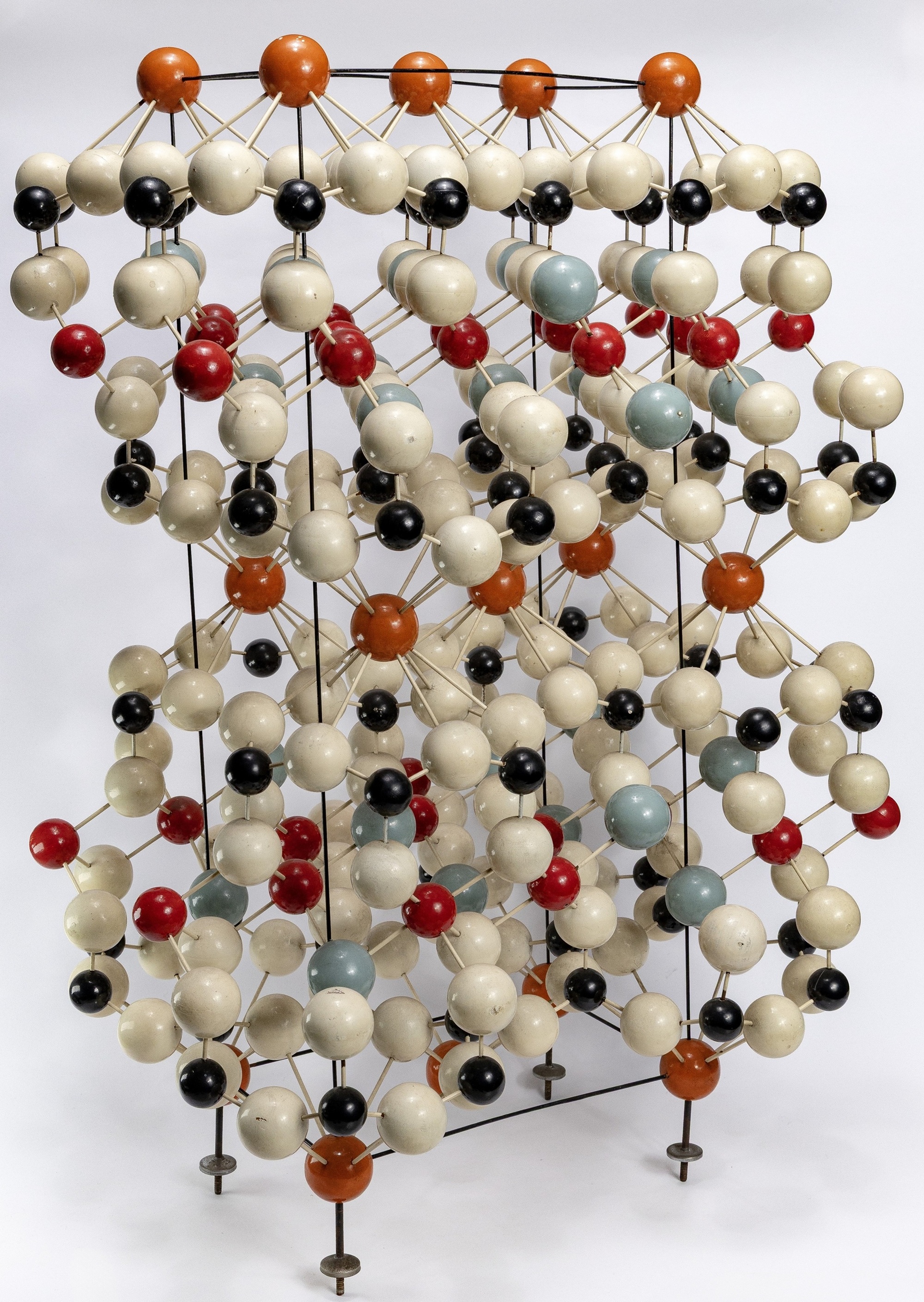 Si tratta di un modello molecolare ad asta e sfera. Gli atomi sono rappresentati da sfere di colore diverso in funzione dell’elemento chimico. Le aste rappresentano i legami chimici, mostrando gli angoli effettivi. La distanza tra i centri delle sfere è proporzionale alla distanza effettiva fra i nuclei. Il raggio delle sfere è più piccolo rispetto alla lunghezza delle aste, per rendere più visibili i legami. Il modello mostra la struttura atomica della muscovite (KAl2(AlSi3O10)(OH)2), caratterizzata dalla ripetizione di due piani formati da anelli esagonali di tetraedri (SiO4), e da un livello interposto di ottaedri (Al-O-OH). Gli strati sono legati fra loro da un piano di ioni K+.