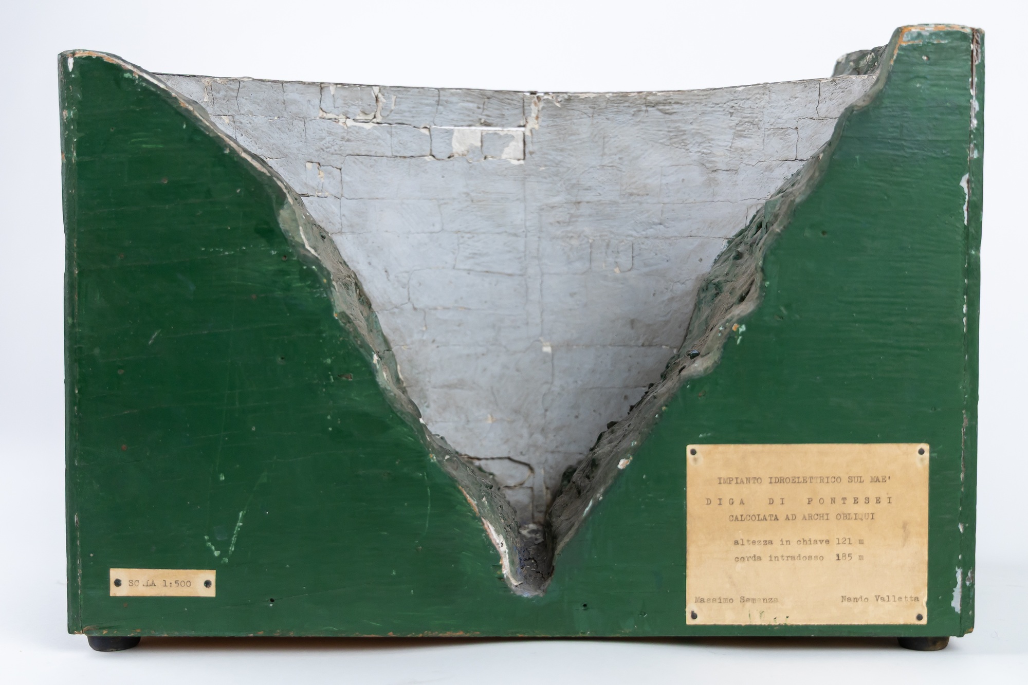 Si tratta del modello della diga progettata da Carlo Semenza e costruita tra il 1955 e il 1957 per sbarrare il torrente Maè, nella Val di Zoldo (Provincia di Belluno). Lo sbarramento diede origine al lago di Pontesei, utilizzato per la produzione di energia idroelettrica. Il 22 marzo 1959 una frana caduta nell'invaso provocò un'ondata che causò una vittima, il custode Arcangelo Tiziani. L'incidente è considerato un'anticipazione del disastro del Vajont per le analogie dell’accaduto. Reca l’etichetta “Impianto idroelettrico sul Maé. Diga di Pontesei calcolata ad archi obliqui. Altezza in chiave 121 m corda intradosso 185 m. Massimo Semenza Nando Valletta”.