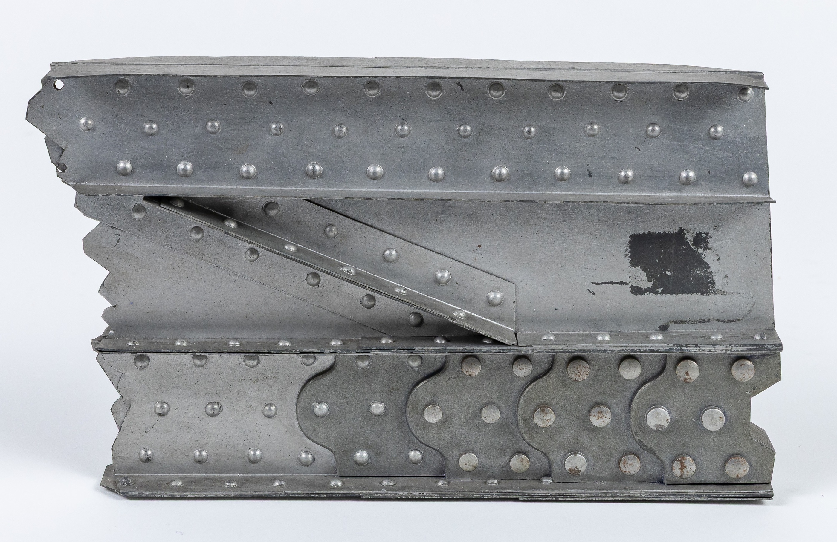 Il modello riproduce il particolare di metà della cerniera in chiave di un ponte ferroviario ad arco a tre cerniere, della lunghezza di 40 metri, con timpani reticolari progettato da J. Palme nel 1880. L’Atlante di Pio Chicchi (1886) descrive il ponte ad arco a tre cerniere illustrando il particolare della cerniera in chiave. Nella sezione centrale si evidenzia la parte simmetrica della trave superiore e dell’anima piena rinforzata con tirante.