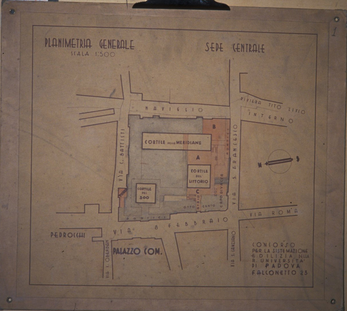 Palazzo Bo. Planimetria generale del Palazzo Bo in scala 1:500 con evidenziazione zone da ristrutturare o ricostruire. Progetto concorso.