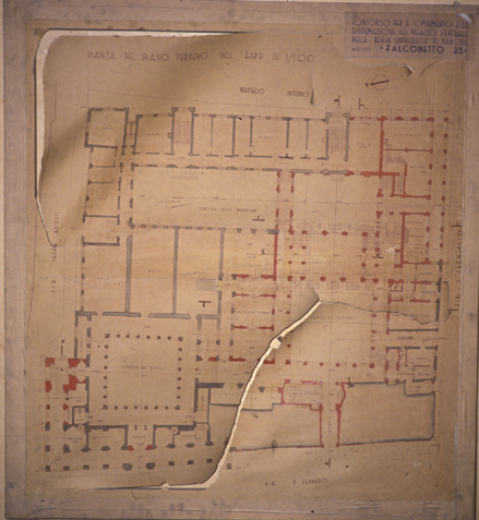 Palazzo Bo. Pianta del piano terreno in scala 1:100 con evidenziazione delle zone da ristrutturare o ricostruire. Progetto concorso.