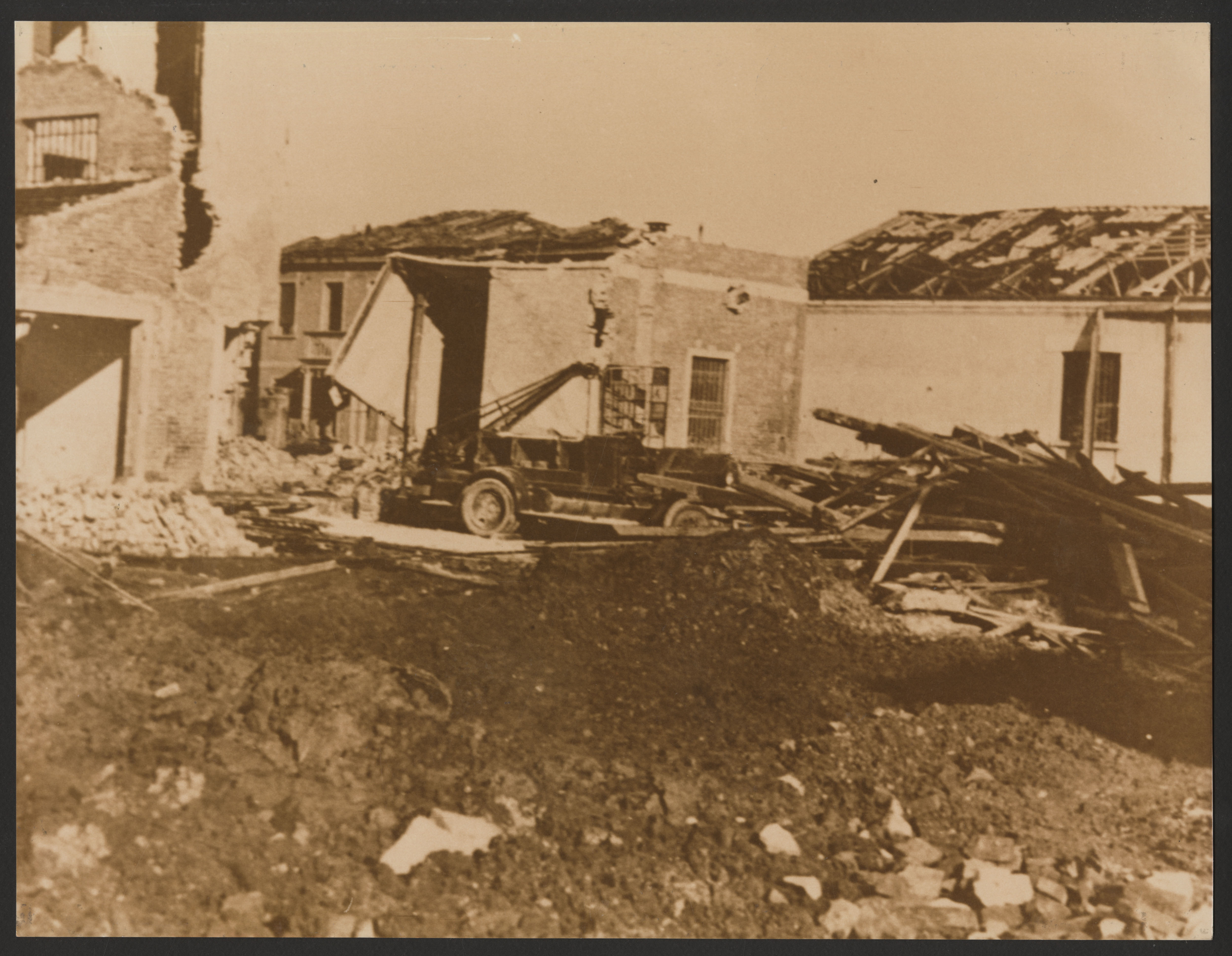 Edificio bombardato e macerie in via Stefano dell'Arzere