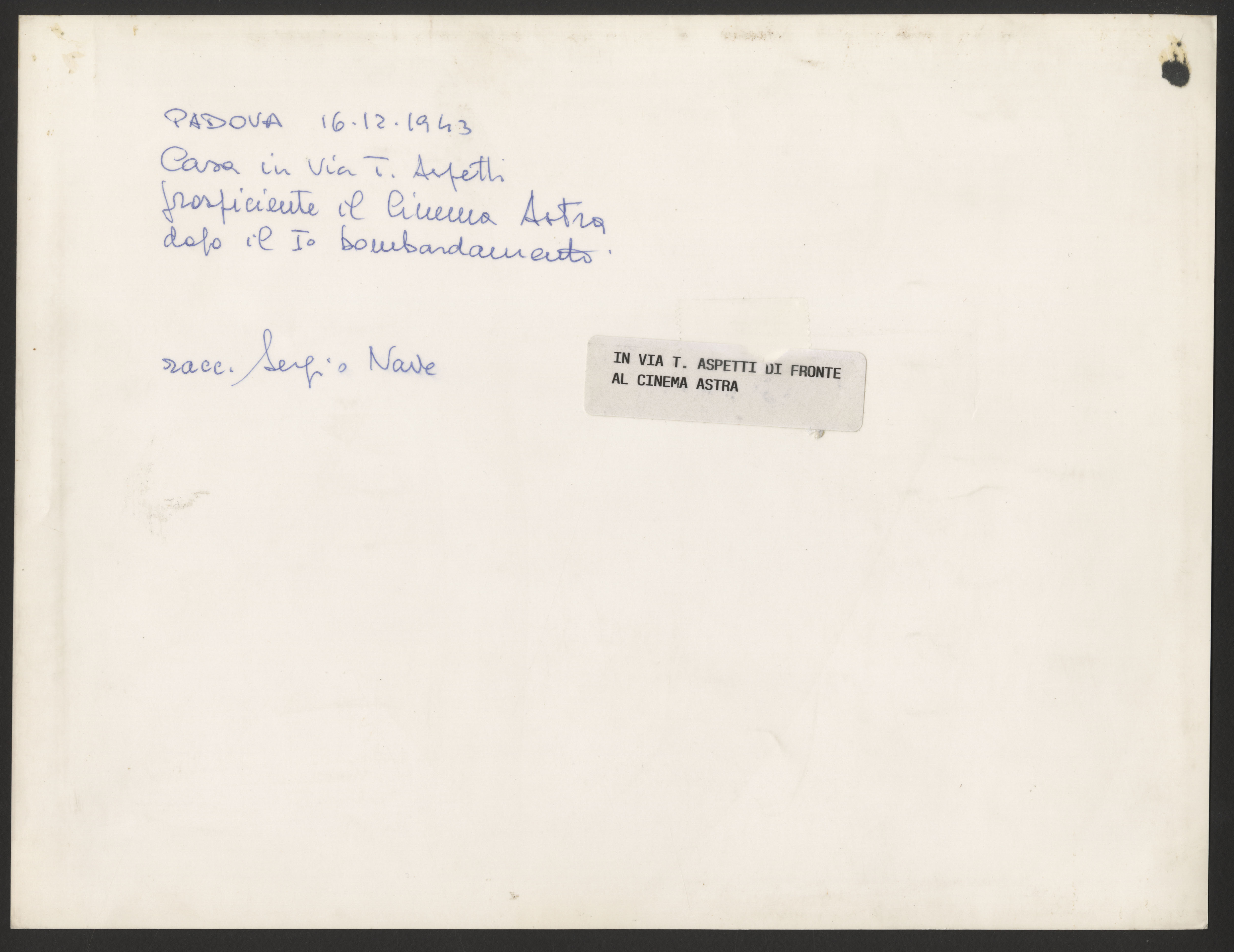 Annotazione manoscritta sul verso: "Padova 16-12-1943 Casa in Via T. Aspetti prospiciente il Cinema Astra dopo il I bombardamento. racc. Sergio Nave".