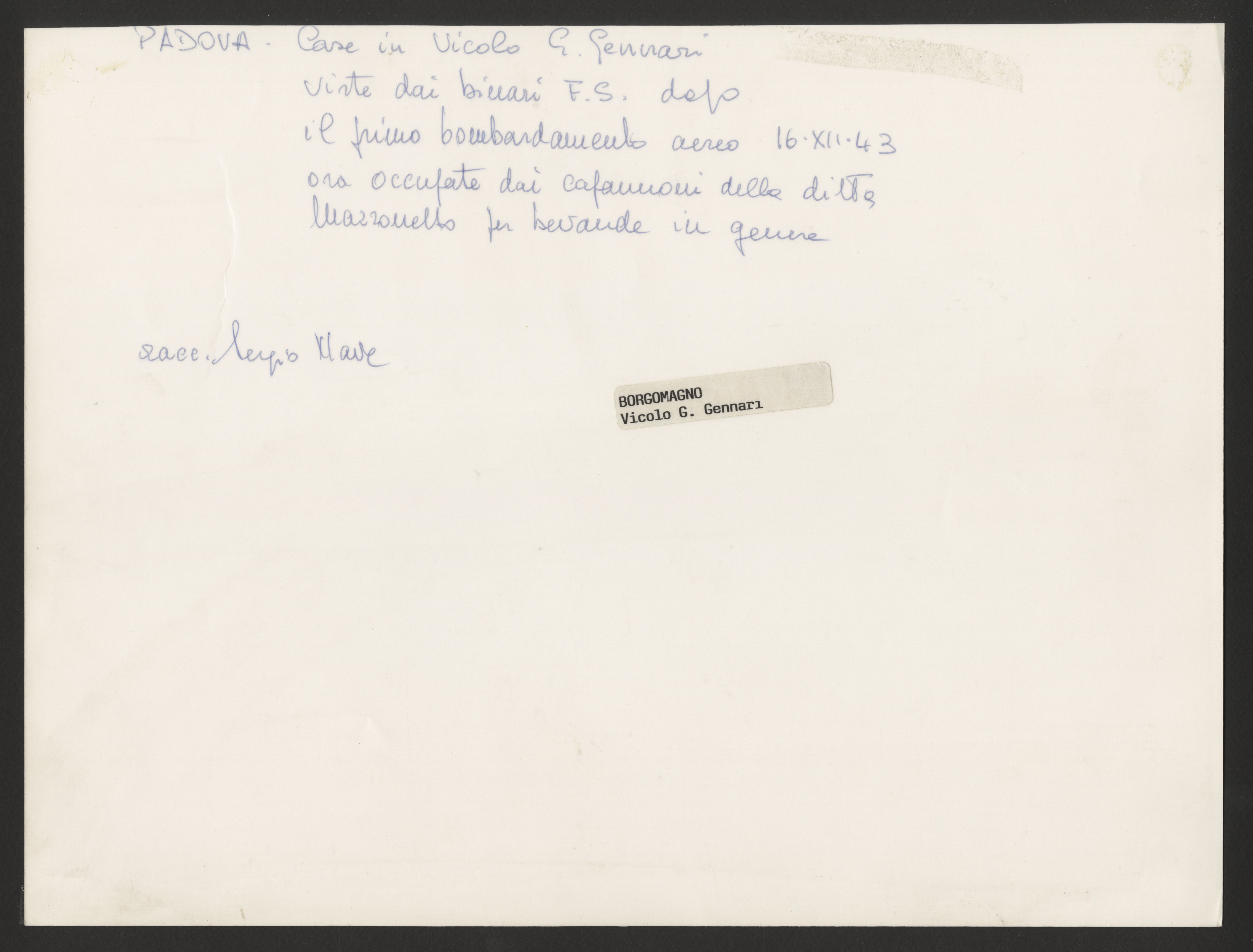 Annotazione manoscritta sul verso: "Padova – Case in Vicolo G. Gennari viste dai binari F.S. dopo il primo bombardamento aereo 16-XII-43 ora occupate dai capannoni della ditta Mazzomello per bevande in genere. racc. Sergio Nave".