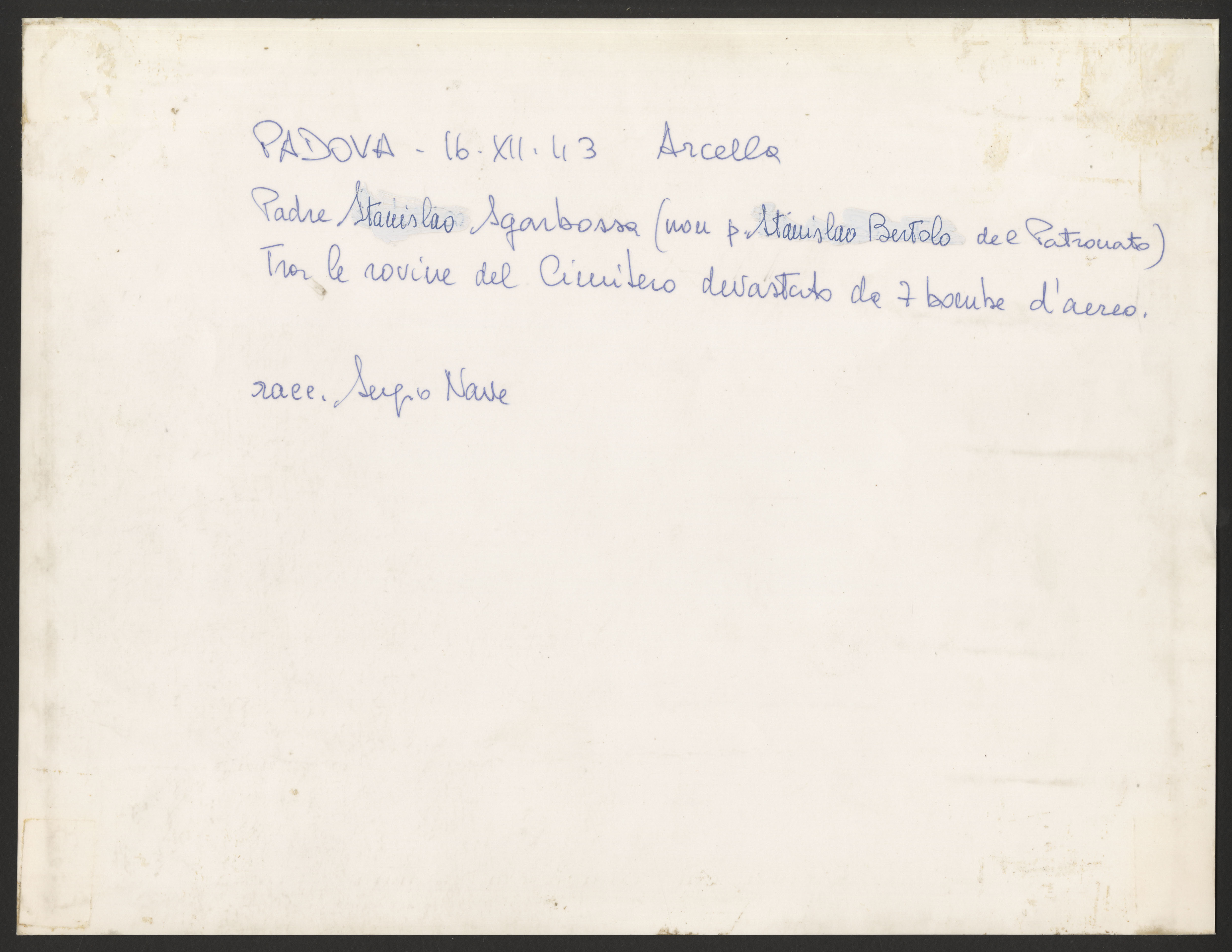 Annotazione manoscritta sul verso: "Padova – Arcella – 16.XII.43. I bombardamento. Padre Stanislao Sgarbossa (non p. Stanislao Bortolo del Patronato) tra le rovine del Cimitero devastato da 7 bombe d'aereo. racc. Sergio Nave".