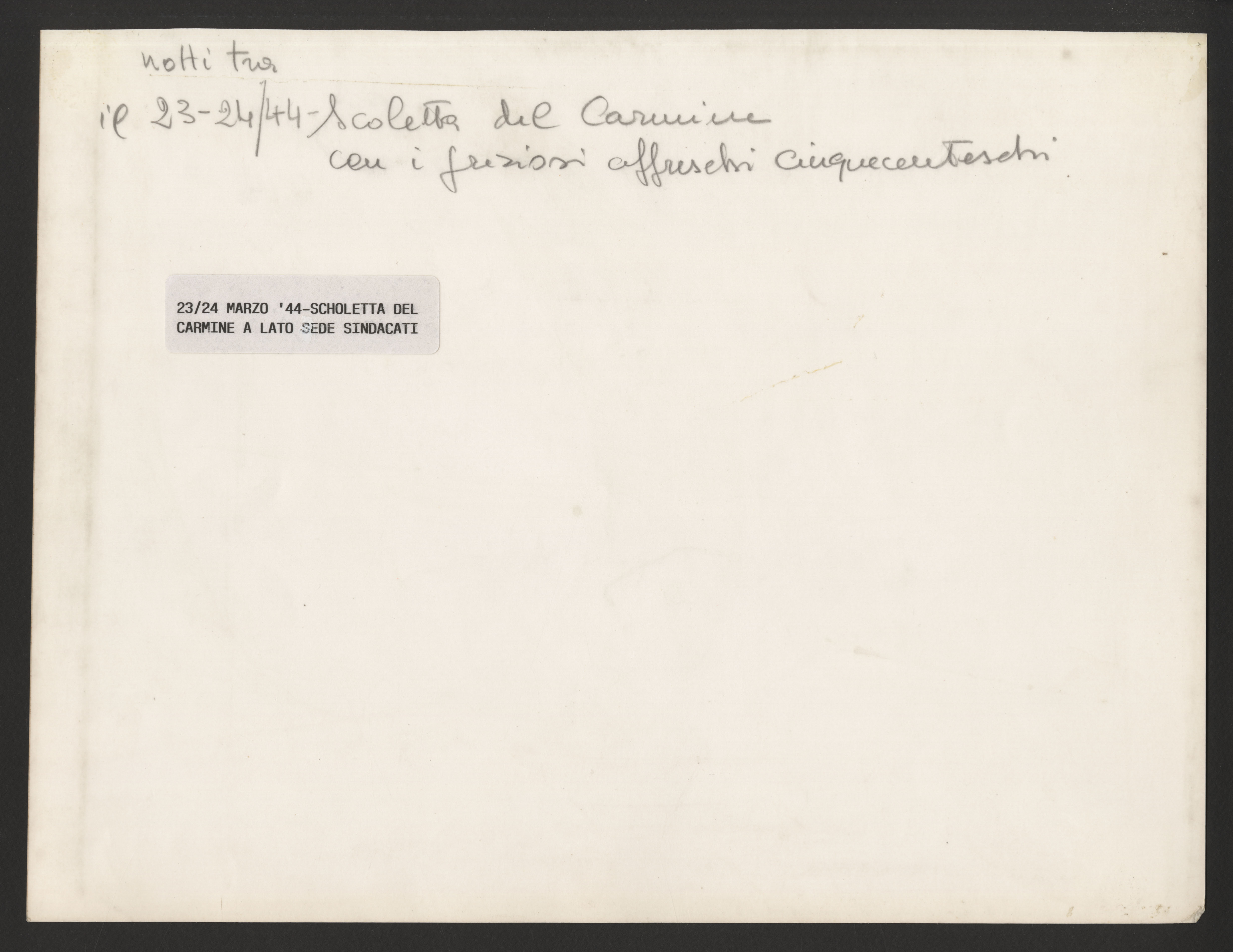 Annotazione manoscritta sul verso: "notti tra il 23-24/44 – Scoletta del Carmine con i preziosi affreschi cinquecenteschi".