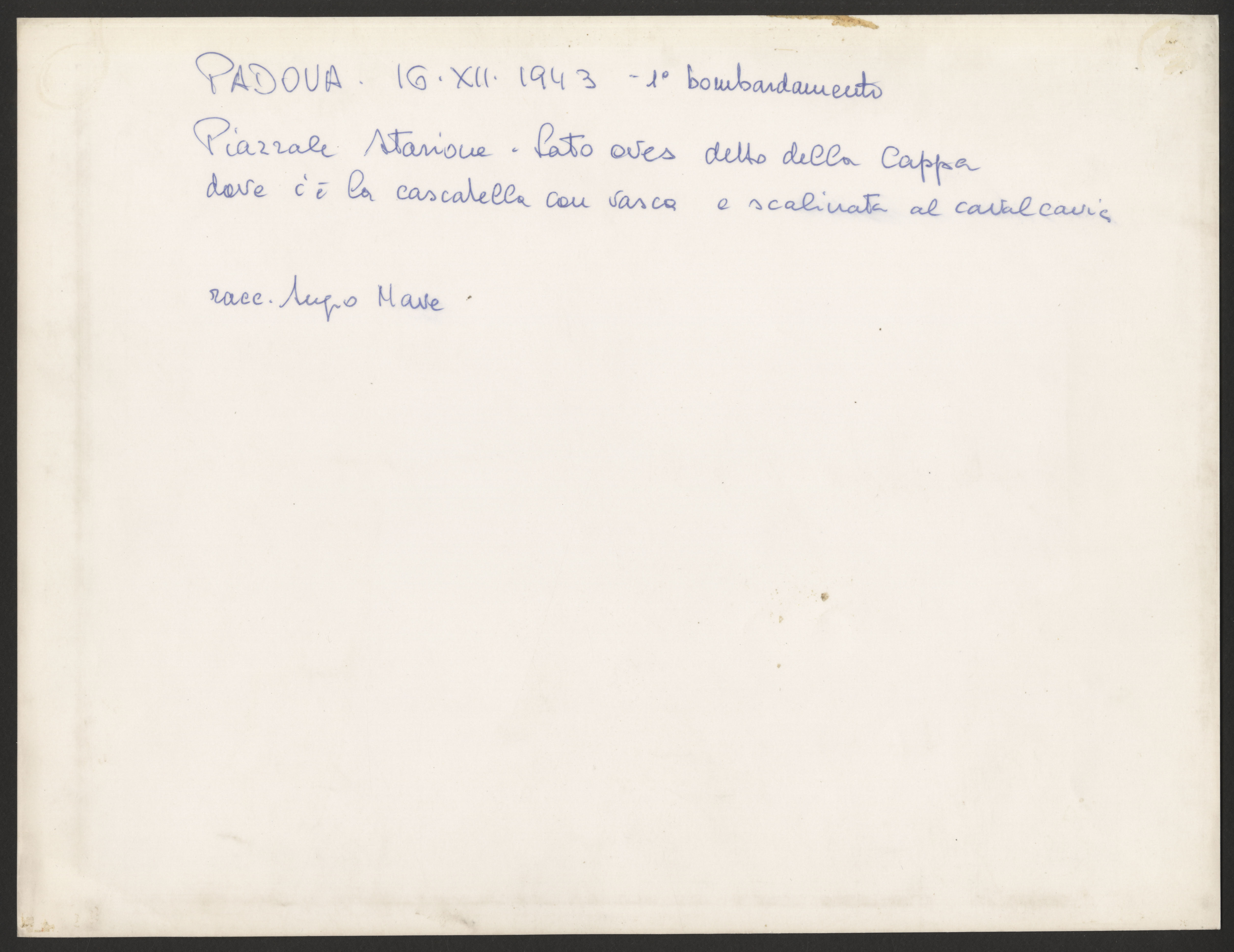 Annotazione manoscritta sul verso: "Padova - 16.XII.1943 - 1° bombardamento. Piazzale stazione. Lato oves[t] detto della Cappa dove c'è la cascatella con vasca e scalinata al cavalcavia. racc. Sergio Nave".