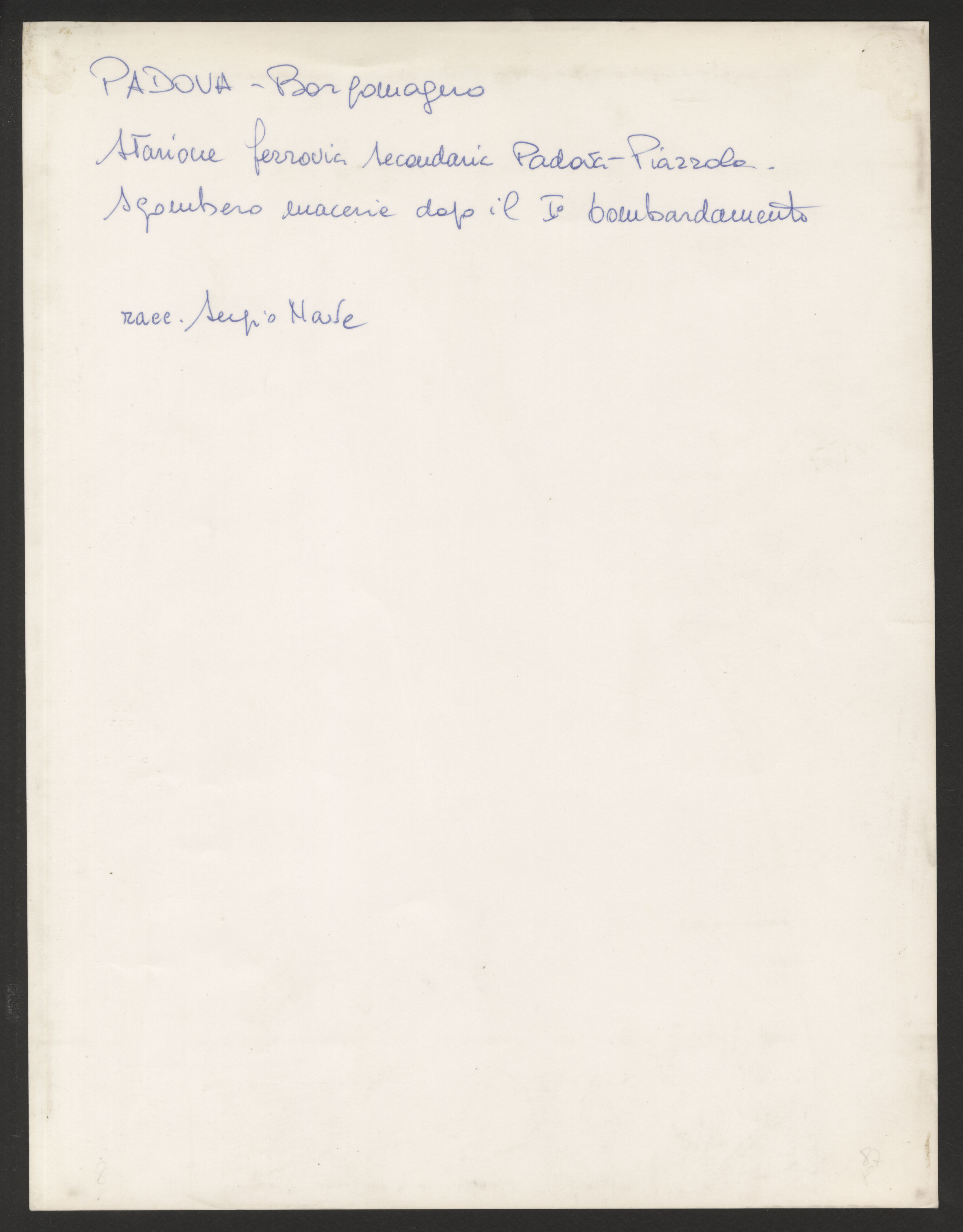 Annotazione manoscritta sul verso: "Padova - Borgomagno. Stazione ferroviaria secondaria Padova-Piazzola. Sgombero macerie dopo il I° bombardamento. racc. Sergio Nave".
