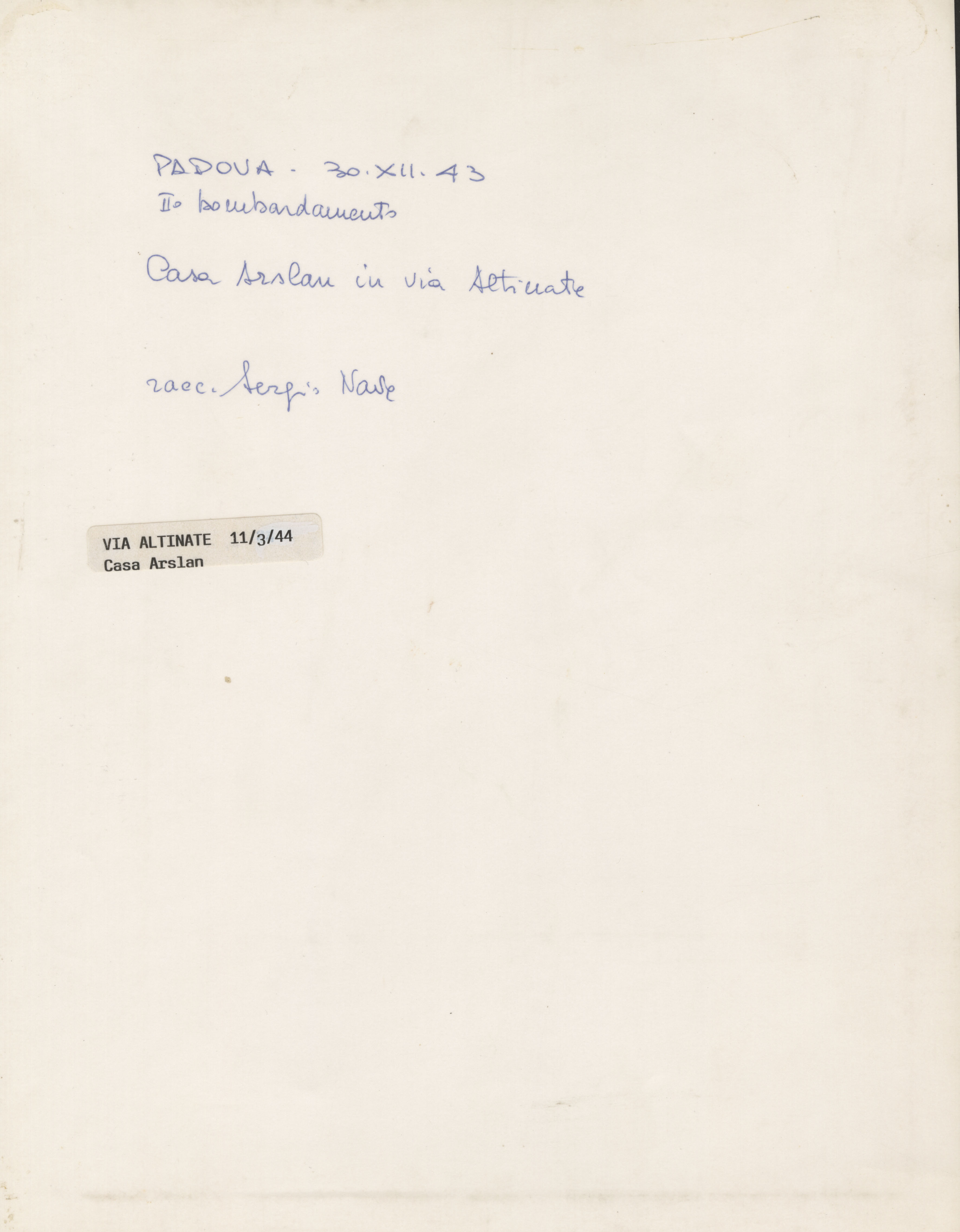 Didascalia dattiloscritta apposta sul verso: "Via Altinate 11/3/44. Casa Arslan".