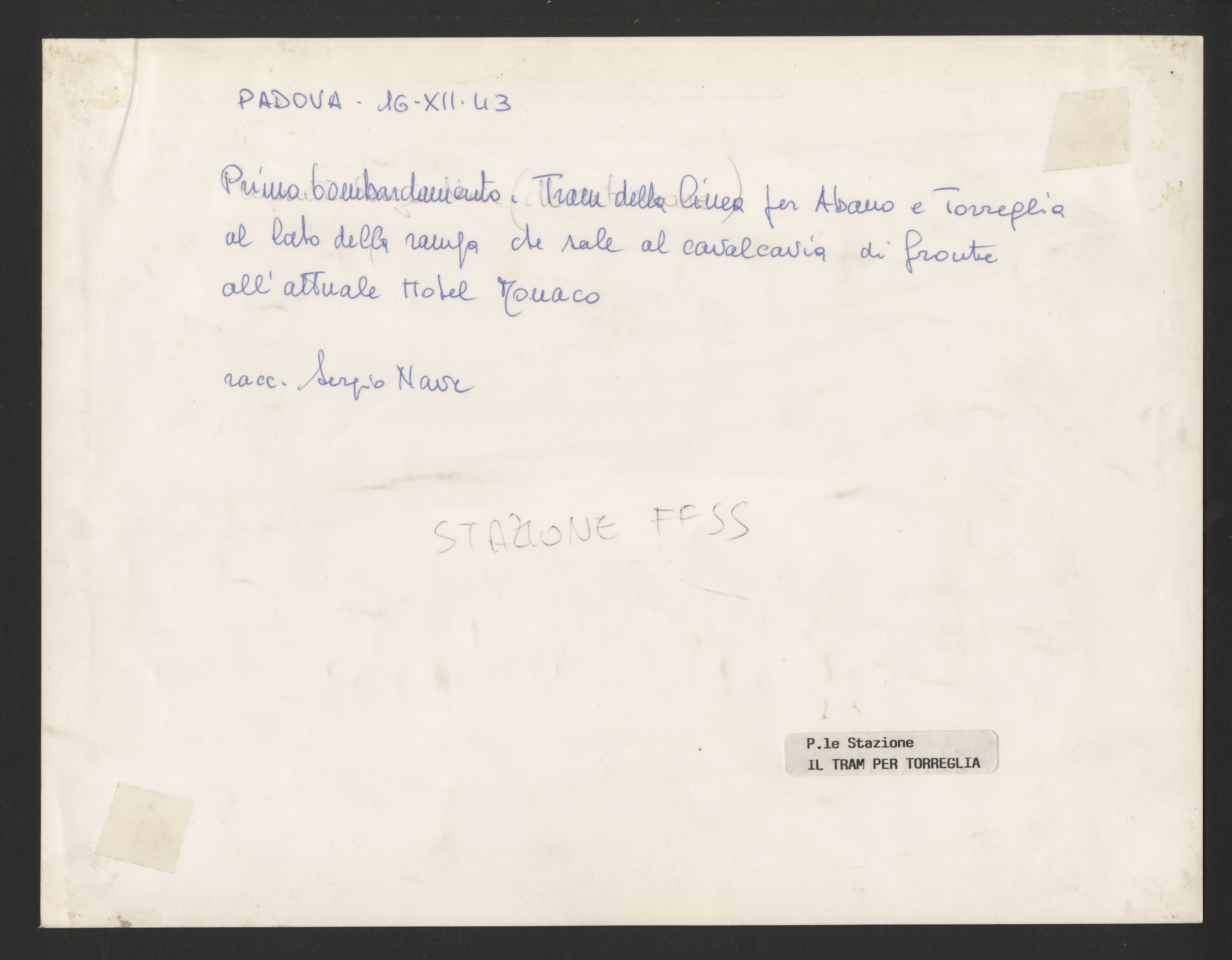Annotazione manoscritta sul verso: "Padova - 16.XII.43. Primo bombardamento. Tram della linea per Abano e Torreglia al lato della rampa che sale dal Cavalcavia di fronte all'attuale Hotel Monaco. racc. Sergio Nave".