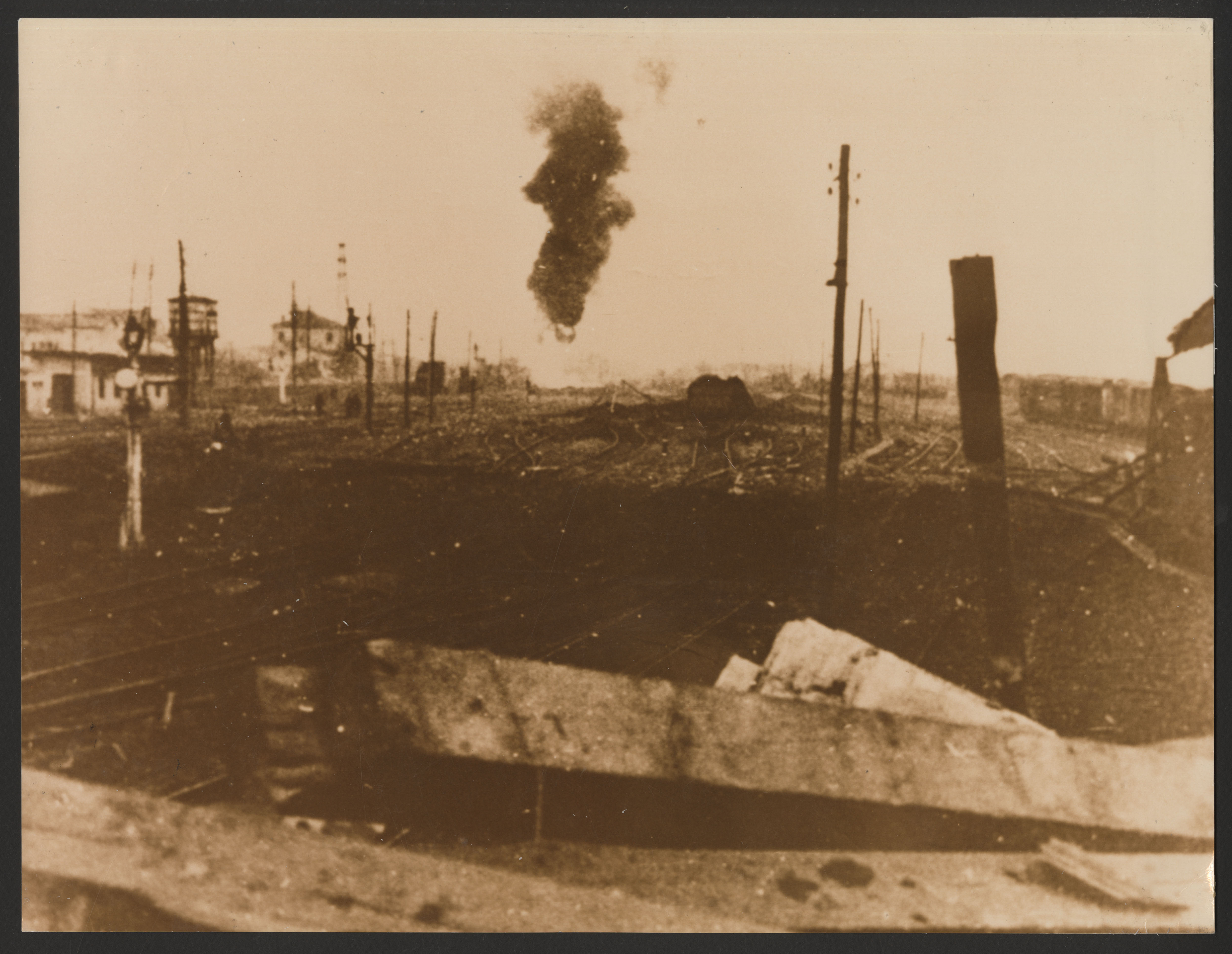 Annotazione manoscritta sul verso: "Padova - 16.XII.43. Dopo il primo bombardamento aereo sullo scalo nord. Carro cisterna in fiamme. racc. Sergio Nave".