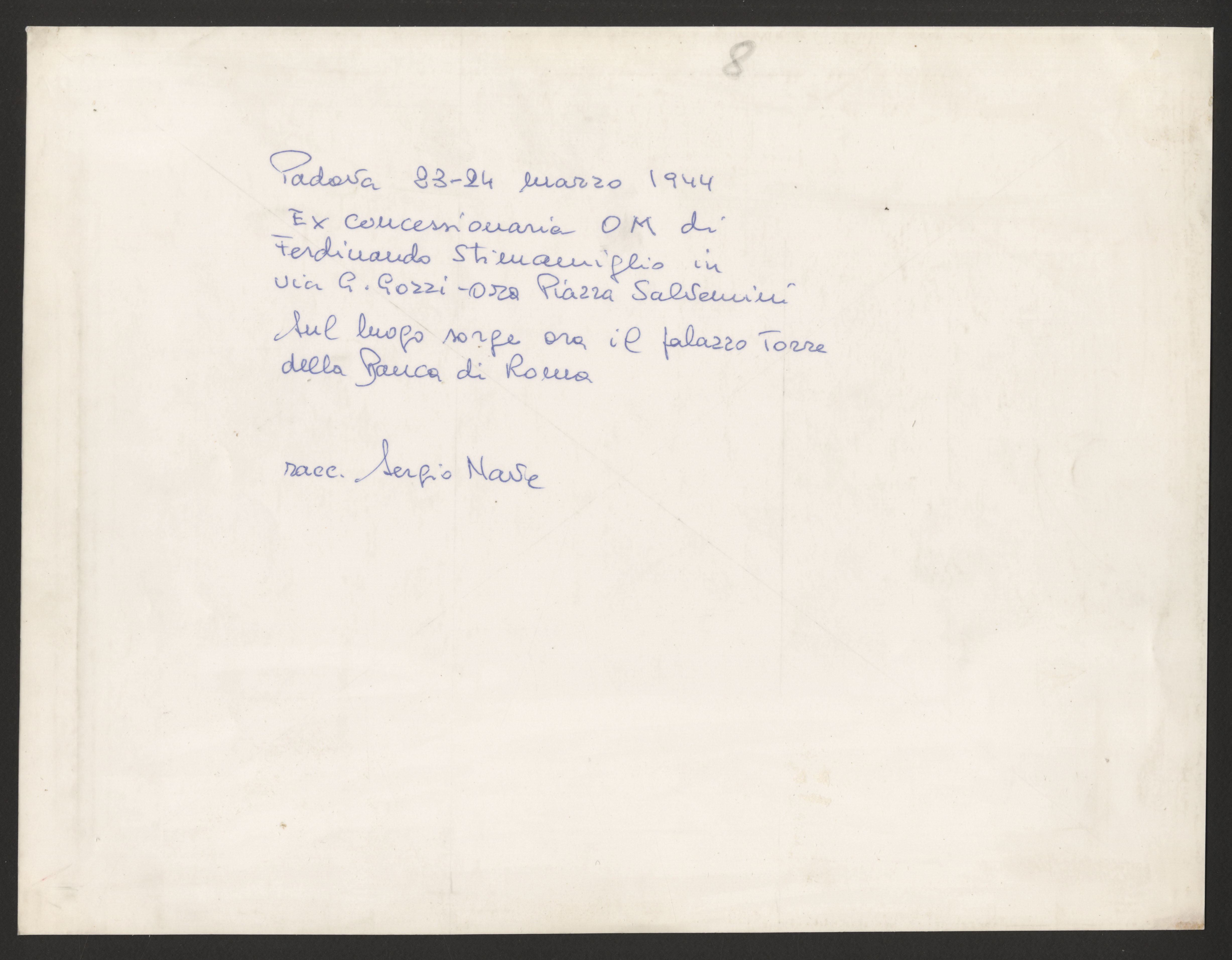 Annotazione manoscritta sul verso: "Padova 23-24 Marzo 1944. Ex concessionaria OM di Ferdinando Stimamiglio in via G. Gozzi – ora Piazza Salvemini. Sul luogo sorge ora il palazzo Torre della Banca di Roma. racc. Sergio Nave".