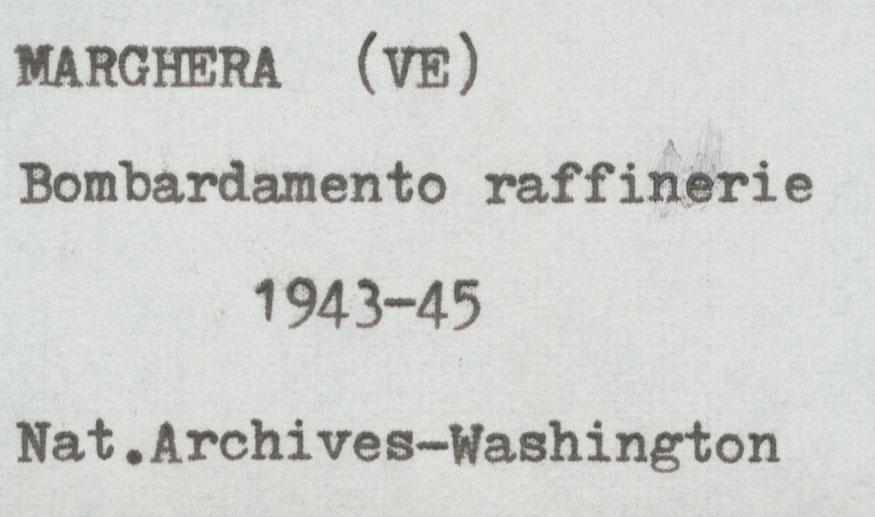 Didascalia dattiloscritta proveniente dalla collezione privata di Sergio Nave: "Marghera (VE). Bombardamento raffinerie 1943-45. Nat. Archives – Washington".