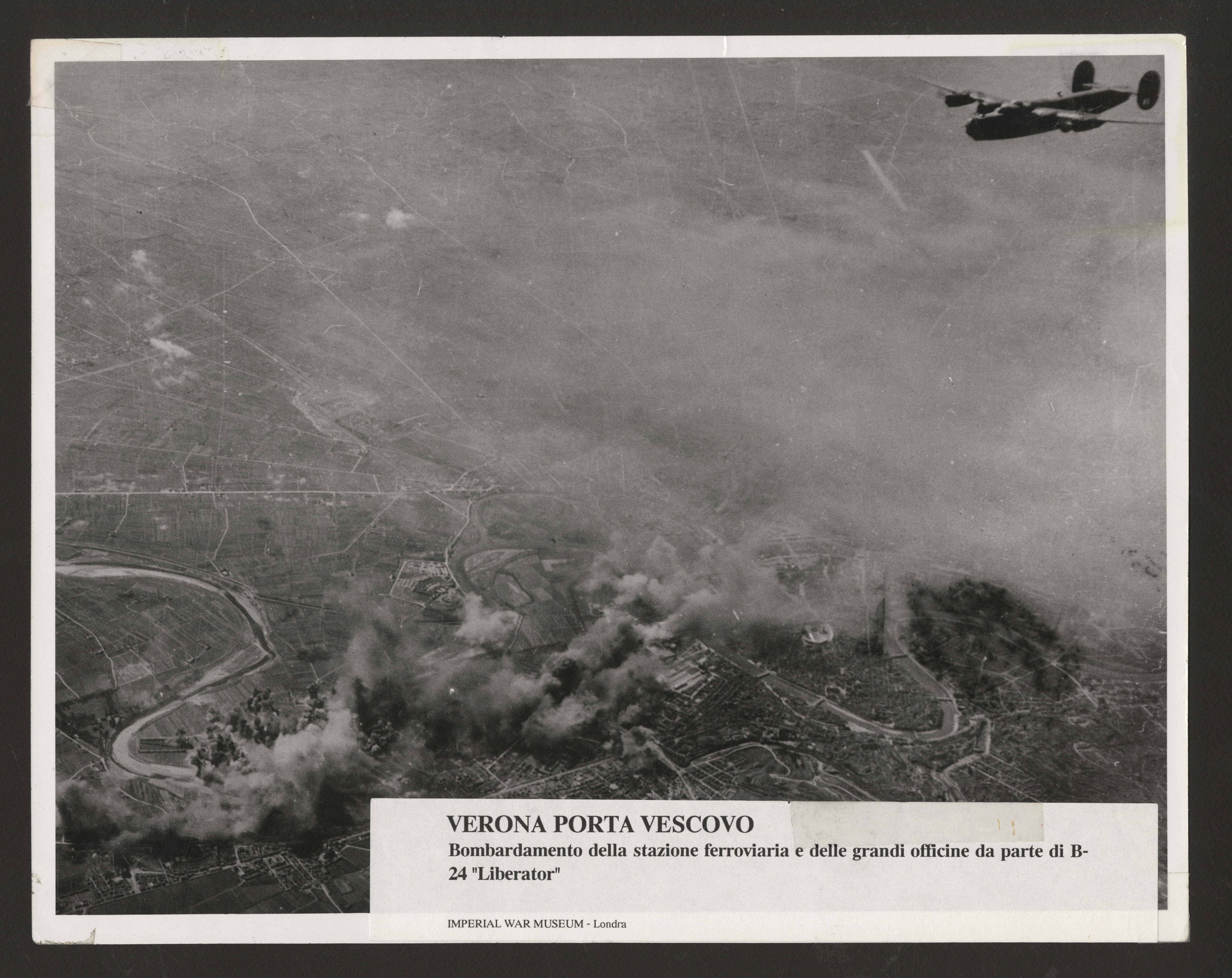 Didascalia dattiloscritta apposta in calce: "Verona Porta Vescovo. Bombardamento della stazione ferroviaria e delle grandi officine da parte di B-24 "Liberator". Imperial War Museum - Londra".