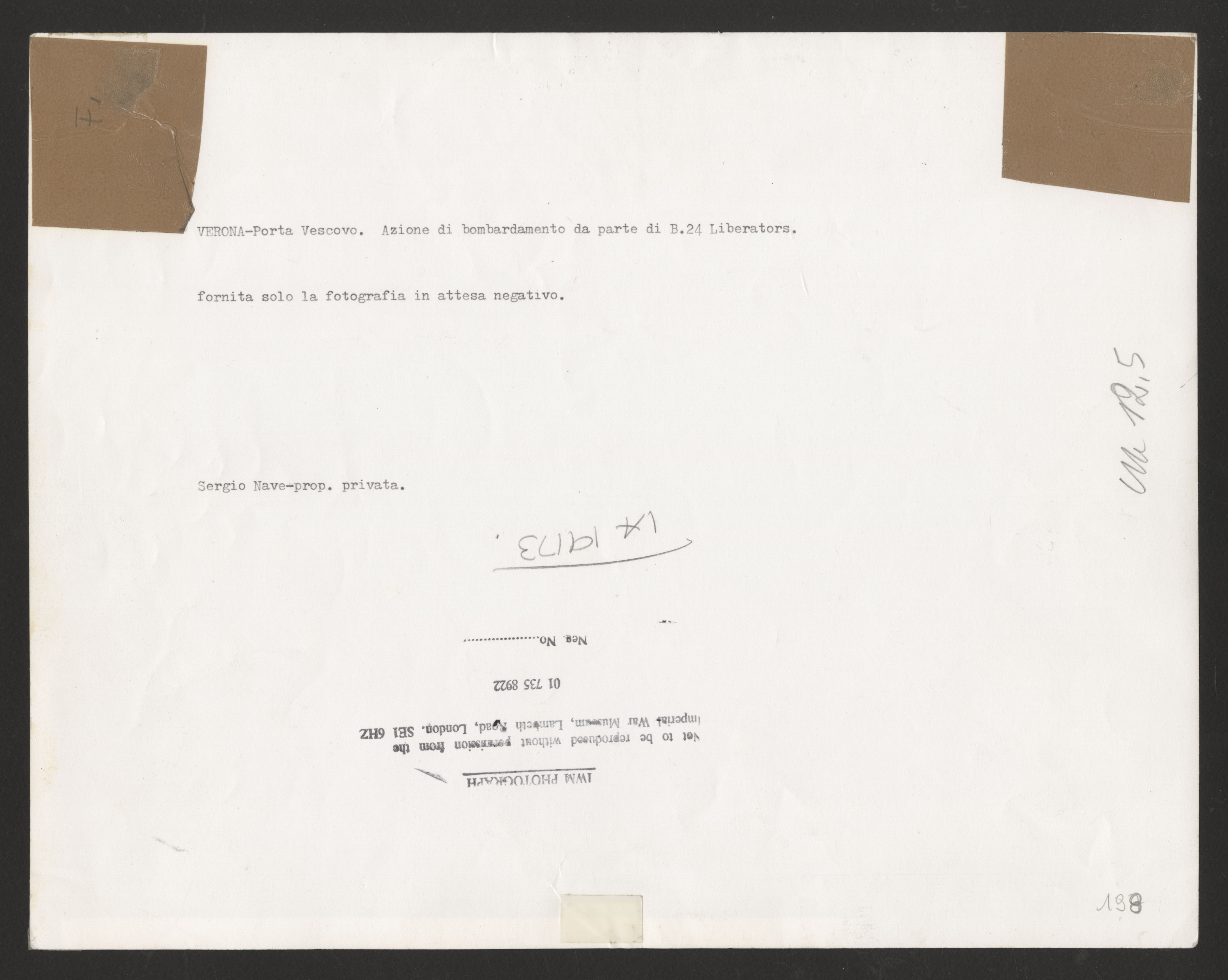 Didascalia dattiloscritta apposta in calce: "Verona Porta Vescovo. Bombardamento della stazione ferroviaria e delle grandi officine da parte di B-24 "Liberator". Imperial War Museum - Londra".
