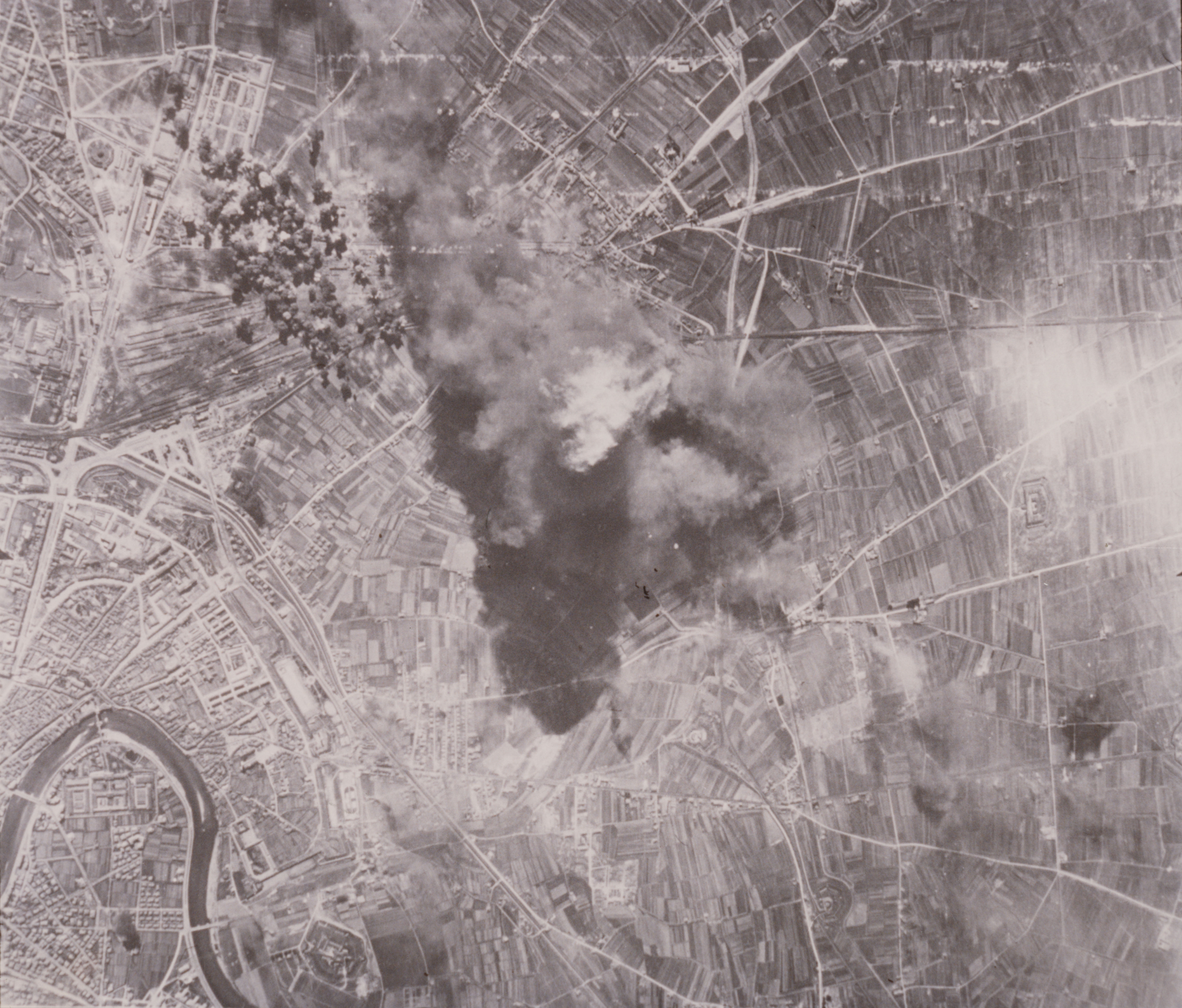 Veduta dall'alto di Verona Porta Nuova durante un bombardamento; si vedono salire delle colonne di fumo.