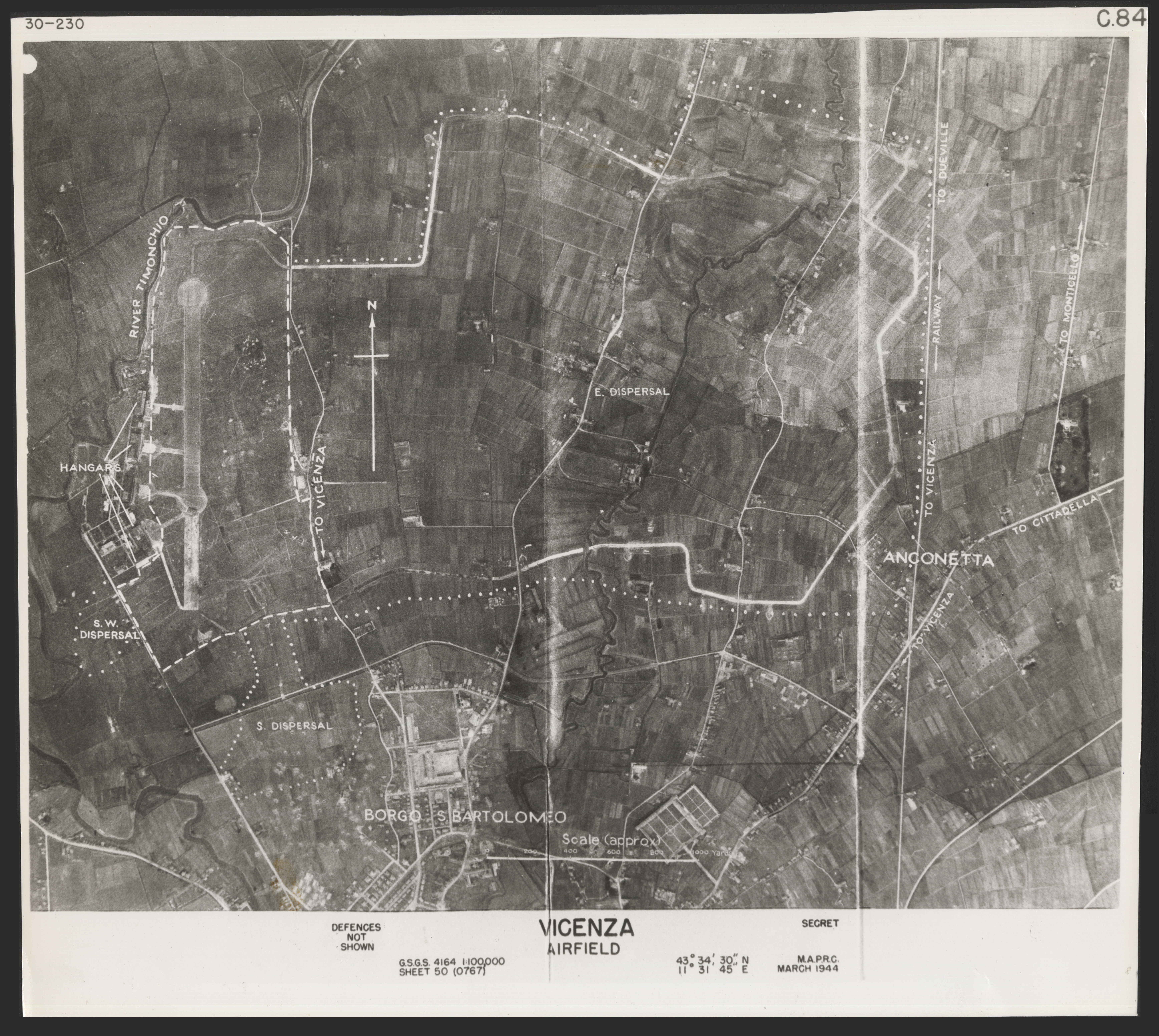 Veduta dall'alto dell'area circostante Vicenza con indicazioni militari.