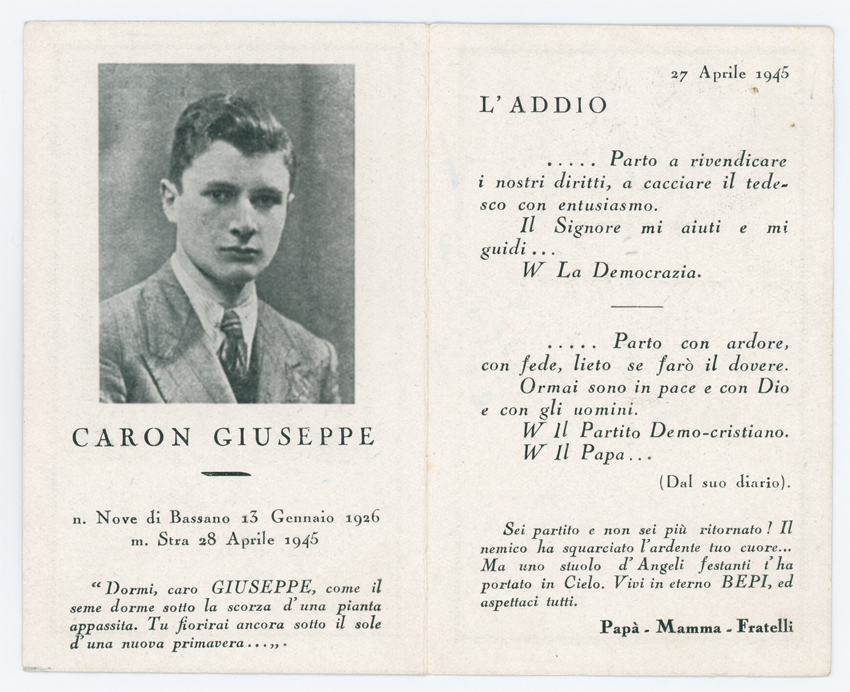 Ricordo funebre di Giuseppe Caron, nato a Nove di Bassano (Vicenza) nel 1926, fucilato dai tedeschi a Stra (Venezia) il 28 aprile 1945.