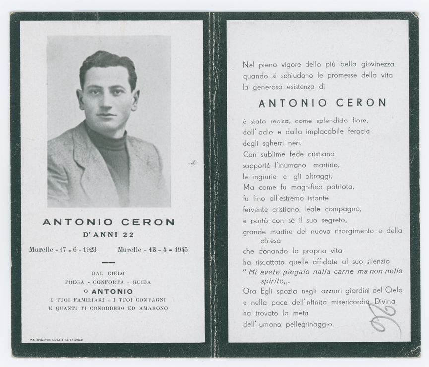 Ricordo funebre di Antonio Ceron, nato a Murelle di Villanova (Padova) nel 1923, partigiano della brigata “G. Negri”, torturato e ucciso a Campodarsego (Padova) l’11 aprile 1945. Medaglia d’oro al Valor Militare.