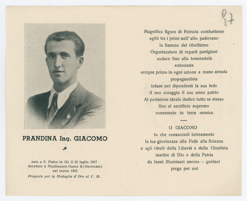 Ricordo funebre di Giacomo Prandina, nato a San Pietro in Gù (Padova) nel 1917, commissario politico della Divisione “Vicenza”, arrestato dai tedeschi il 31 ottobre 1944, morto a Mauthausen Gusen il 20 marzo 1945. Medaglia d'oro al Valor Militare.