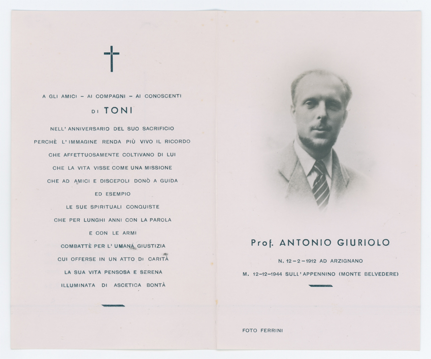 Ricordo funebre di Antonio Giuriolo, nato ad Arzignano il 12 febbraio 1912 e morto a Corona (Lizzano in Belvedere, Bologna) il 12 dicembre 1944, partigiano. Medaglia d'oro al Valor Militare alla memoria.