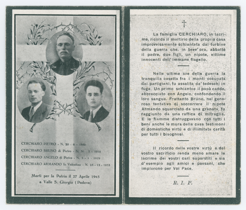 Ricordo funebre di Pietro, Bruno, Angelo e Armando Cerchiaro, nati rispettivamente il 20 giugno 1880, 30 maggio 1910, 5 gennaio 1919, 25 dicembre 1933 e morti a Valle San Giorgio (Padova) il 27 aprile 1945.