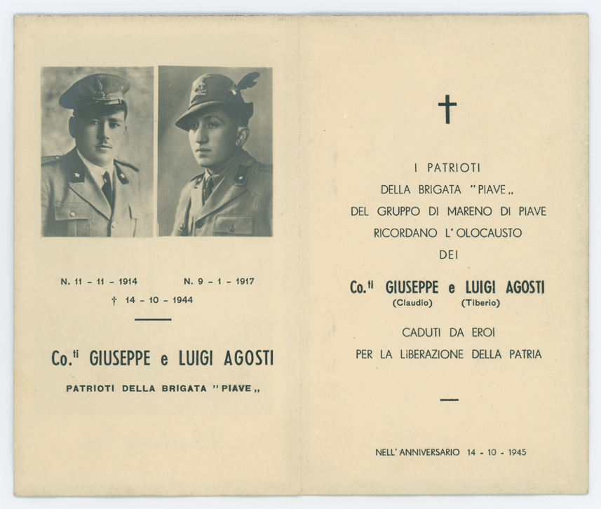 Ricordo funebre di Giuseppe Agosti, nato a Treviso l' 11 novembre 1914 e Luigi Agosti, nato a Treviso il 19 gennaio 1917, patrioti della brigata "Piave" morti insieme a Refrontolo (Treviso) il 14 ottobre 1944. Luigi Agosti è stato insignito della medaglia d'oro al Valor Militare alla memoria.