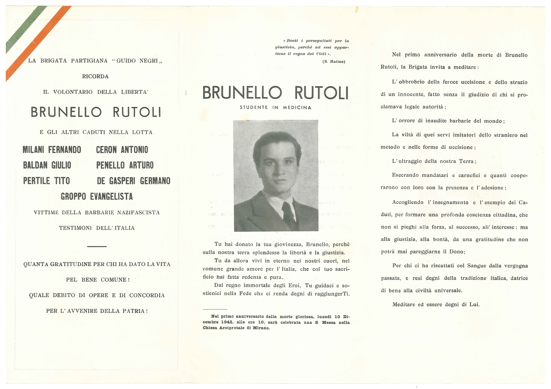 Ricordo funebre formato manifesto di Brunello Rutoli, nato a Sanremo il 29 novembre 1923 e morto a Codevigo il 10 dicembre 1944, partigiano della Brigata "Guido Negri". Il necrologio ricorda altri caduti della Brigata "Guido Negri".