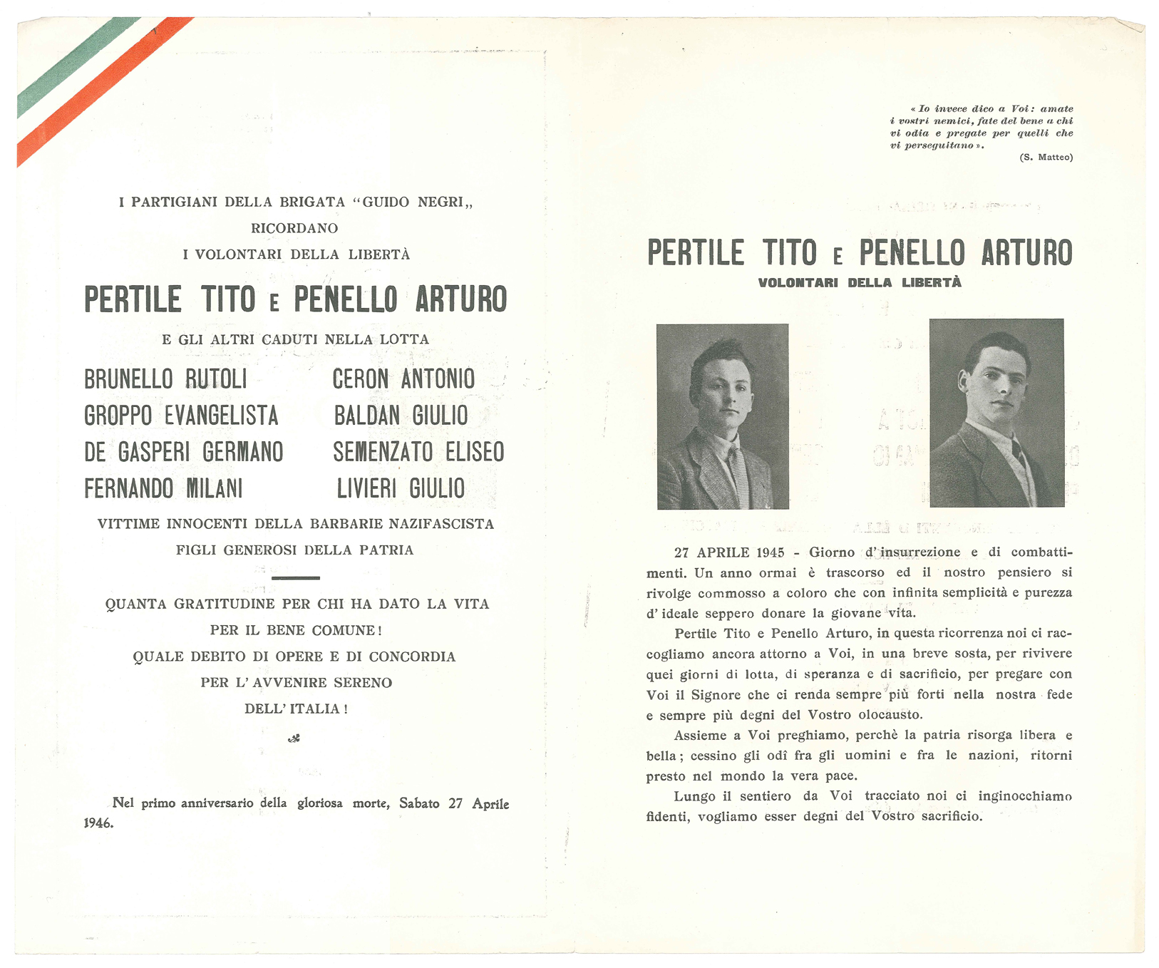 Ricordo funebre formato manifesto di Tito Pertile e Arturo Penello, morti il 27 aprile 1945, partigiani della Brigata "Guido Negri". Il necrologio ricorda altri caduti della Brigata "Guido Negri".