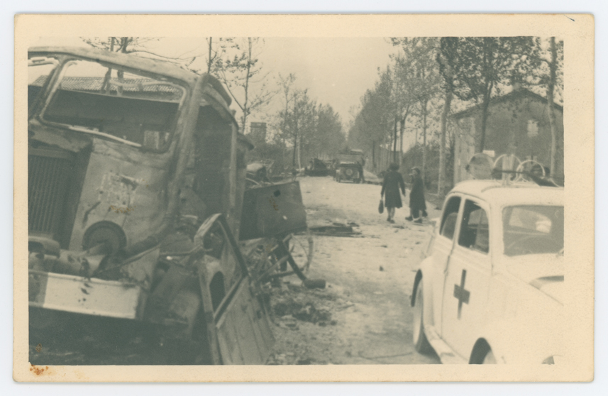 Colle Umberto (Treviso), 30 aprile 1945. Resti della colonna tedesca bloccata sul Menarè e mitragliata dall’aviazione alleata.