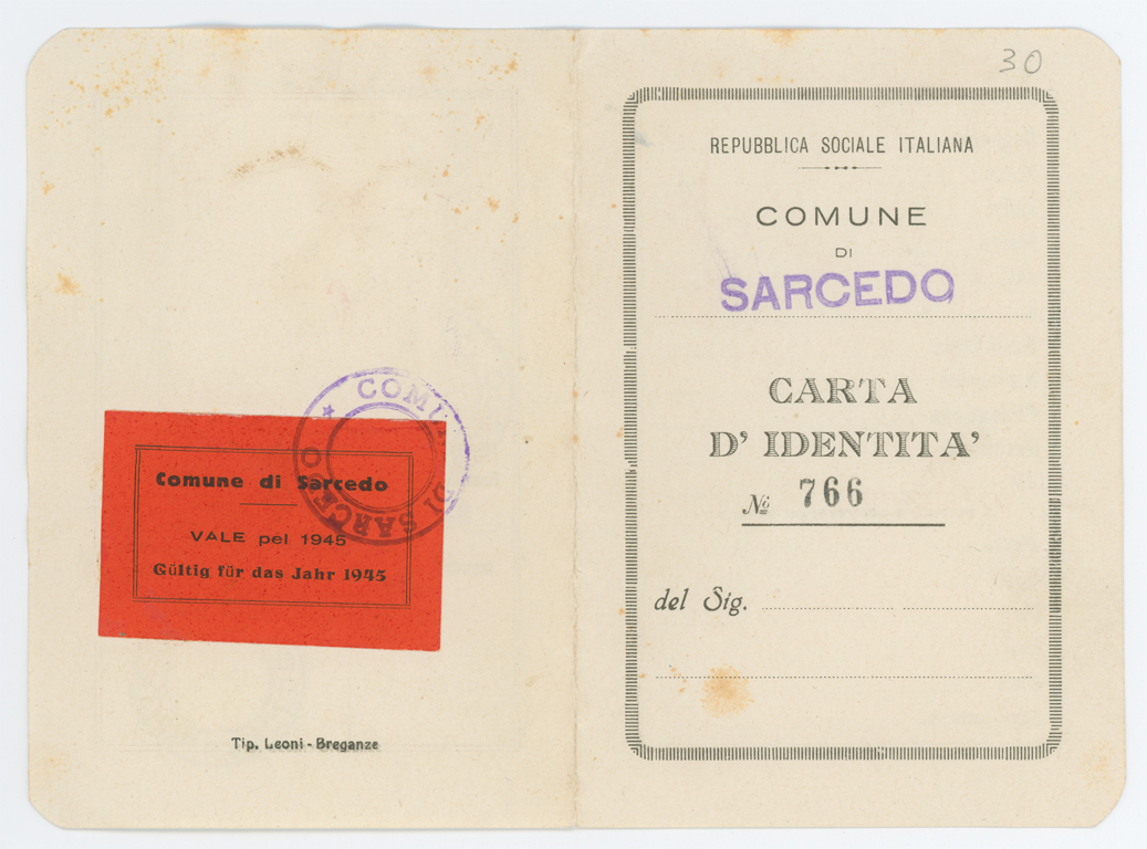 Carta d'identità della Repubblica Sociale Italiana con foto di Giacomo Chilesotti. Il documento è privo di dati anagrafici, ma riporta il timbro del Comune di Sarcedo e la data 15 aprile 1945.