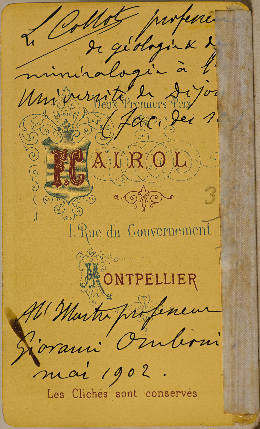 Nota manoscritta sul verso: L. Collot professeur de geologie de mineralogie à l'Universite de Dijon (Fac. du sc.). Al'Illustre professeur Giovanni Omboni. Mai 1902.