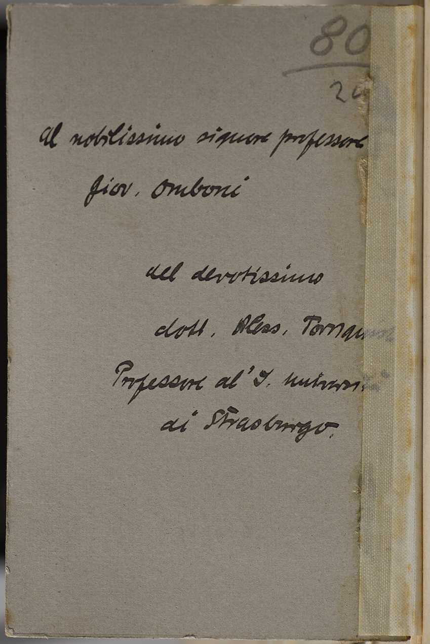 Nota manoscritta sul verso: Al nobilissimo signor professore Giov. Omboni dal devotissimo dott. Aless. Tornquist. Professore all'Università di Strasburgo.