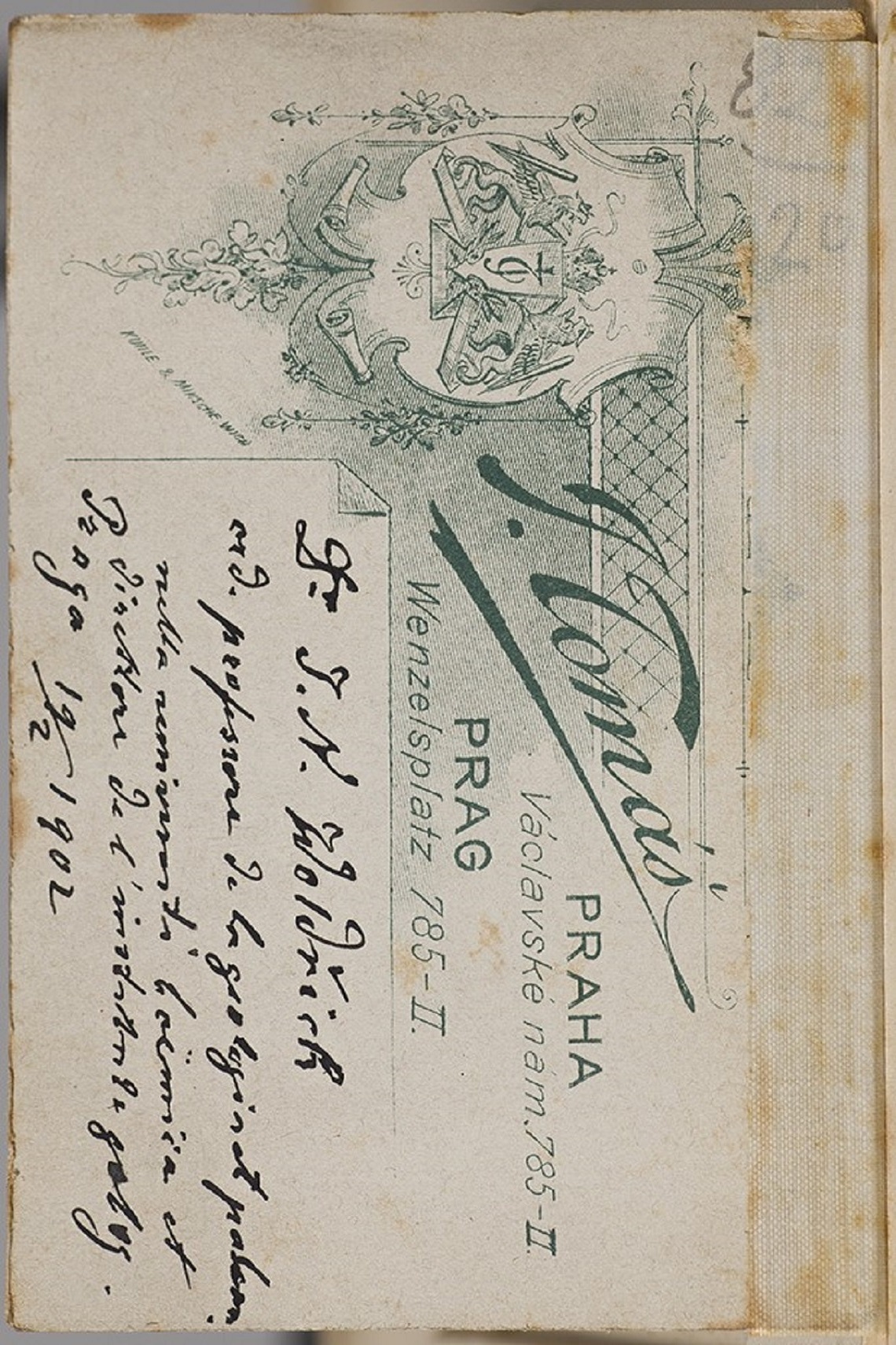 Nota manoscritta sul verso: Dr. J. N. Woldrich ord. professore de la geologia et paleon. nella università di boëmia et direttore de l'instituo de geolog. Praga 12.2.1902.