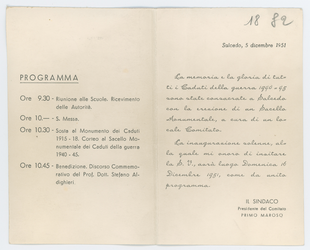Invito, con fotografia del monumento, all'inaugurazione del sacello monumentale dedicato ai caduti della Seconda Guerra Mondiale, tenutasi a Salcedo (Vicenza) il 16 dicembre 1951. L'invito è datato 5 dicembre 1951.