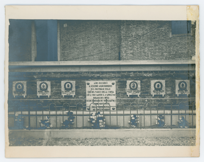 Fotografia del monumento alle vittime di Santa Giustina in Colle (Padova). A Santa Giustina in Colle il 27 aprile 1945 vennero uccisi dai tedeschi a raffiche di mitra contro il muro della chiesa 22 abitanti del luogo e due sacerdoti.