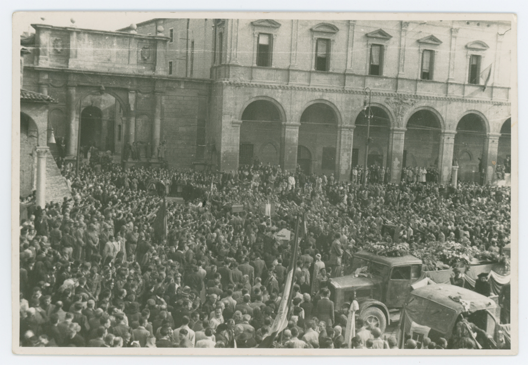 La fotografia raffigura una folla di persone, nella piazza del Duomo, che partecipa ai solenni funerali dei caduti nell'insurrezione di Padova. Negli ultimi giorni dell'aprile del 1945 circa 400 tra partigiani, patrioti e civili insorti persero la vita per mano tedesca nella zona di Padova.