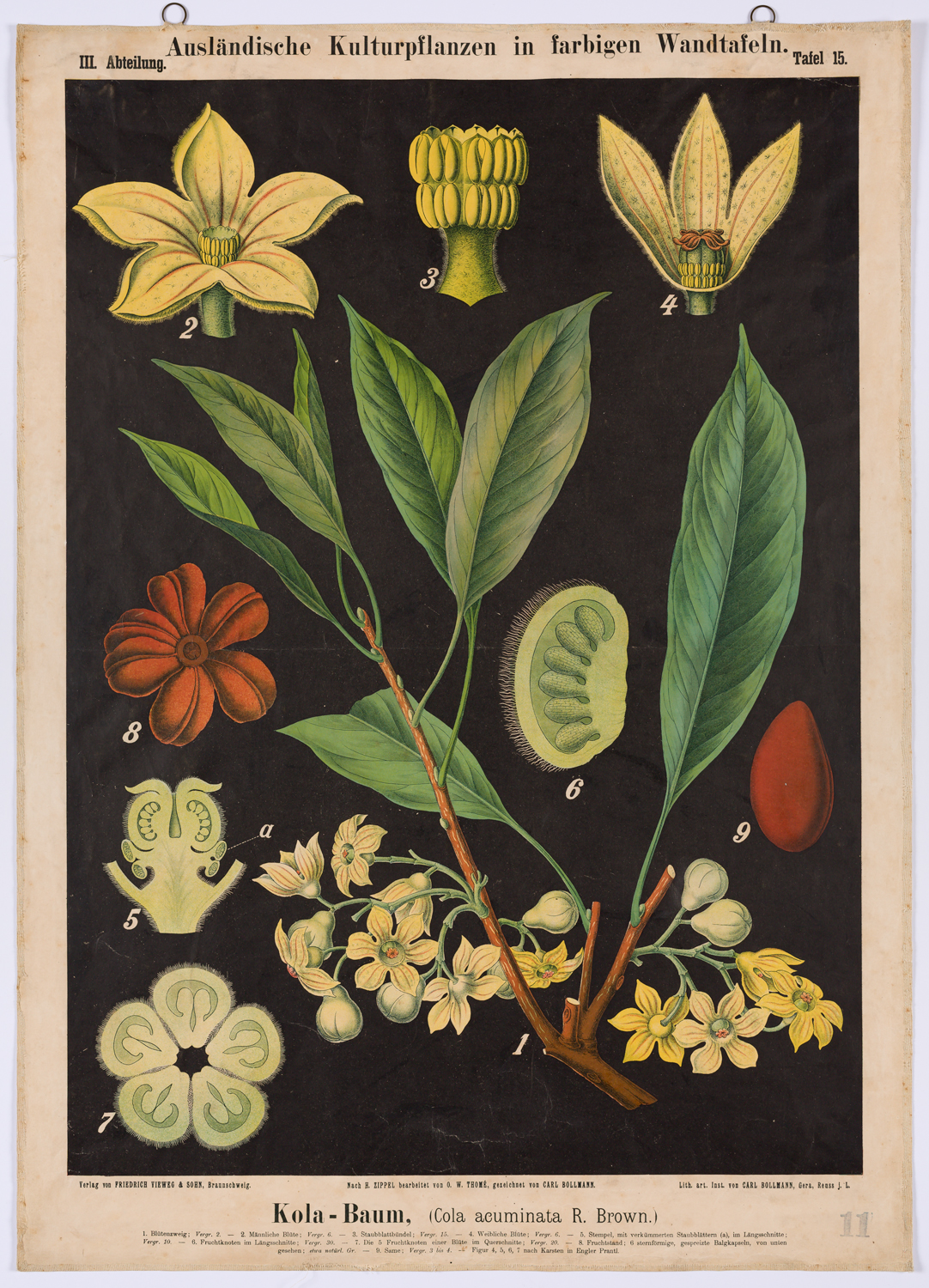 Ausländische Kulturpflanzen in farbigen Wandtafeln. Abteilung III. Tafel 15. La tavola contiene l'immagine di un ramo fiorito, il fiore con particolari, il pistillo in sezione, il frutto e il seme