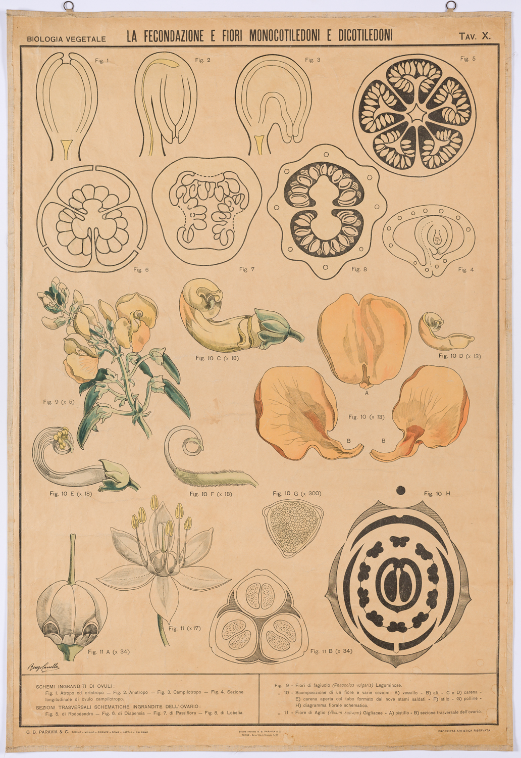 Biologia vegetale. Tav.X. Schemi ingranditi di ovuli: Fig.1. Atropo od ortotropo-Fig.2.Anatropo-Fig.3.Campilotropo- Fig.4. Sezione longitudinale di ovulo campilotropo. Sezioni trasversali schematiche ingrandite dell'ovario: Fig. 5. di Rododendro- Fig.6. di Diapensia - Fig.7.di Passiflora - Fig.8. di Lobelia. Fig.9. Fiori di fagiuolo (Phaseolus vulgaris) Leguminose. 10-Scomposizione di un fiore e varie sezioni: A) vessillo -B)ali -C e D)carena - E)carena aperta col tubo formato dai nove stami saldati - F)stilo - G)polline -H) diagramma fiorale schematico. Fig.11. Fiore di Aglio (Allium sativum)Gigliacee. A)pistillo - B)sezione trasversale dell'ovario.