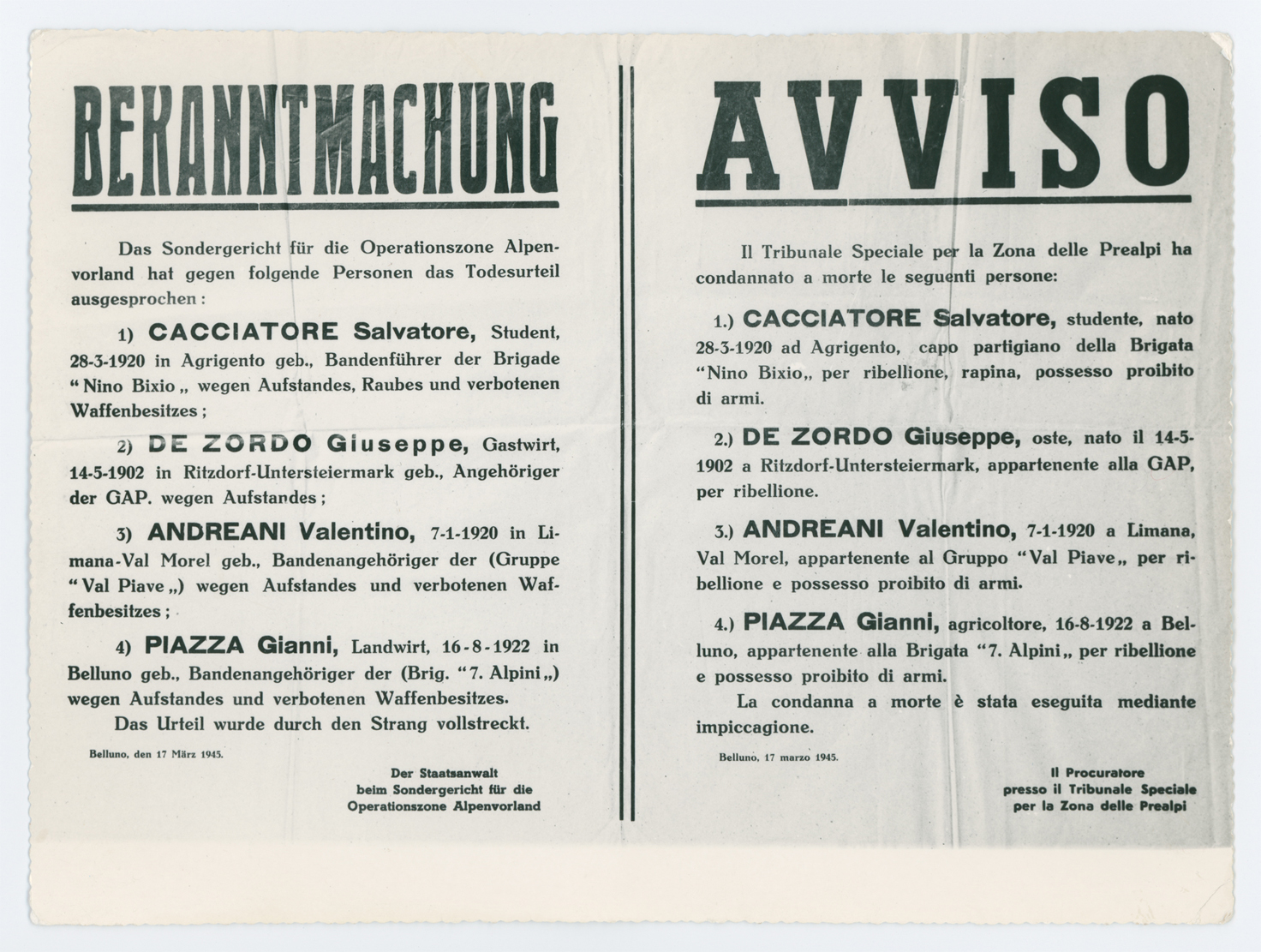 Fotografia di un cartello bilingue che annuncia l'impiccagione dei partigiani Salvatore Cacciatore "Valentino" di Agrigento, Giuseppe De Zordo "Bepi" di Perarolo, Valentino Andreani "Frena" di Limana e Gianleone Piazza "Lino" di Belluno, avvenuta in Piazza Campitello a Belluno il 17 marzo 1945