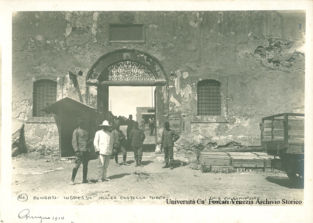 Fotografia in B/N realizzata in gelatina ai sali d'argento su carta ; Sul bordo inferiore dell'immagine la scritta a penna: 166 Bengasi - ingresso all'ex castello turco -Fot. E. Chiaramonte - rip. vietata ; In basso a sinistra la data: Giugno 1914